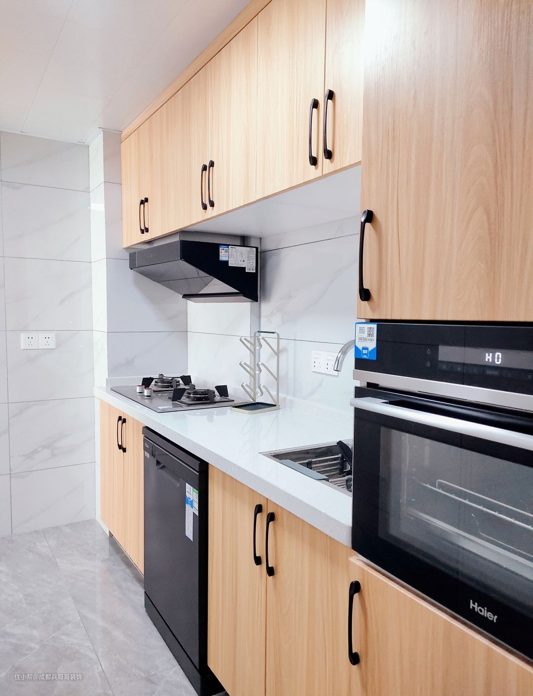 厨房,一字型设计,以白色和原木色作为主色调,简约自然,整洁美观。整体布局上,烹饪区、切菜区、洗菜区、蒸烤区,设计师还设计了嵌入式洗碗机,功能十分齐全,日常生活方便又实用。