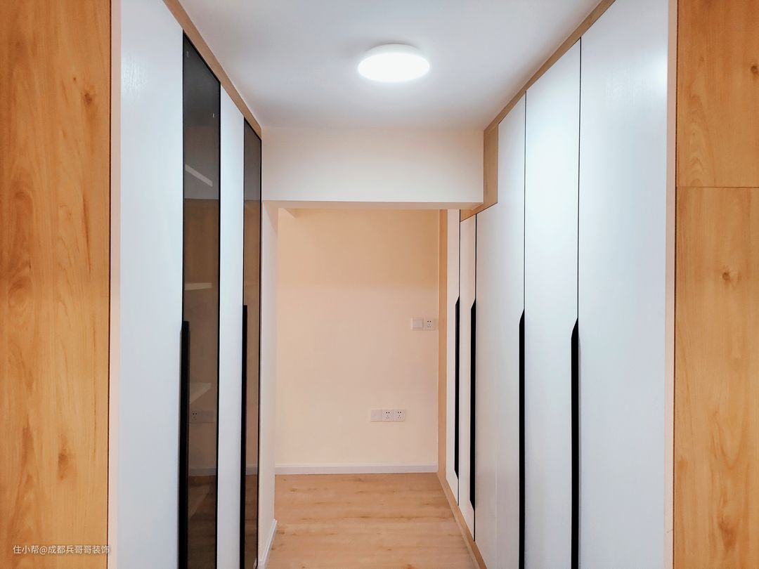 衣帽间,简约色调布局,两面墙均设计了通体衣柜,空间有效得到利用,更加实用方便。