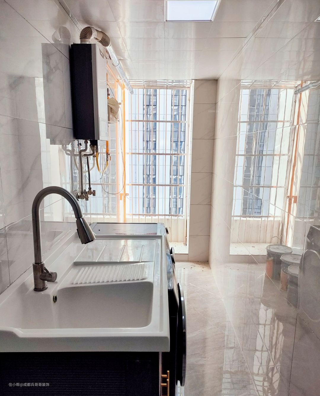 一楼阳台,是生活阳台,满足日常洗衣晾晒。阳台面积狭小,设计师很好地将其利用了起来,不浪费角落空间的同时,还能物尽其用。