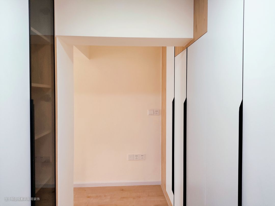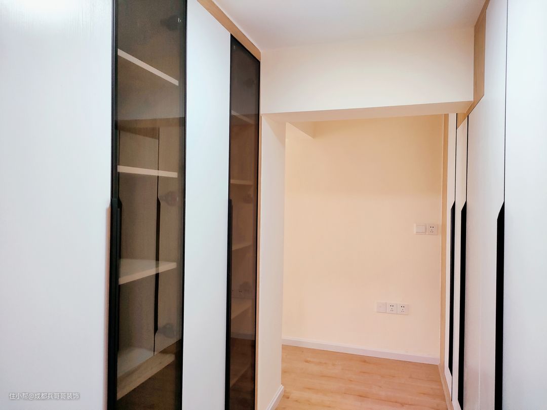 衣帽间,简约色调布局,两面墙均设计了通体衣柜,空间有效得到利用,更加实用方便。