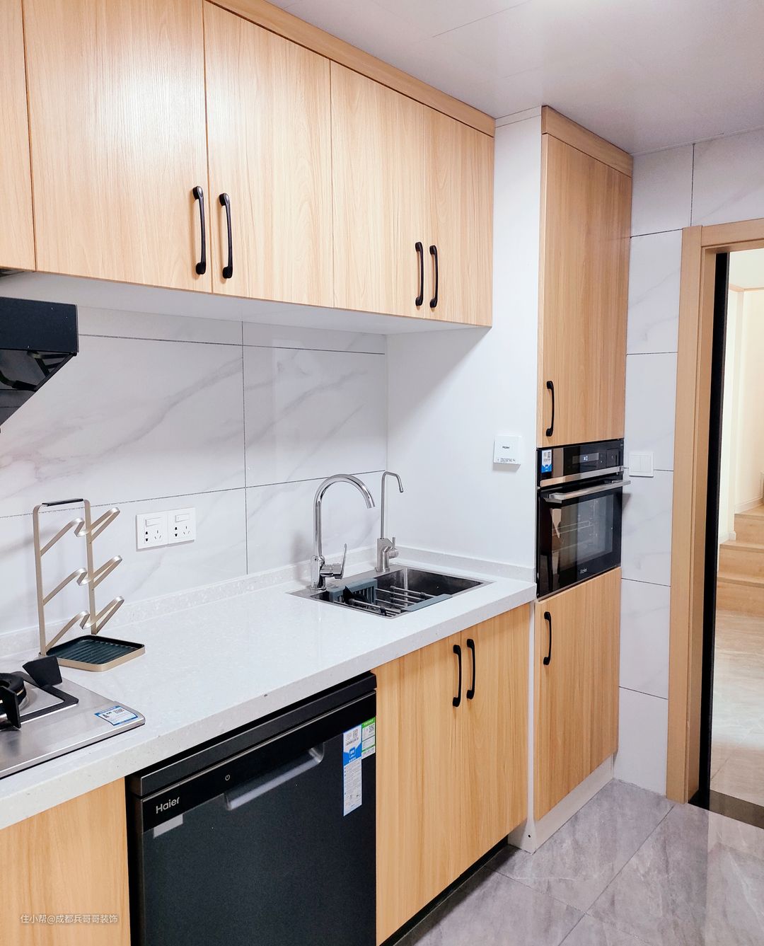 厨房,一字型设计,以白色和原木色作为主色调,简约自然,整洁美观。整体布局上,烹饪区、切菜区、洗菜区、蒸烤区,设计师还设计了嵌入式洗碗机,功能十分齐全,日常生活方便又实用。