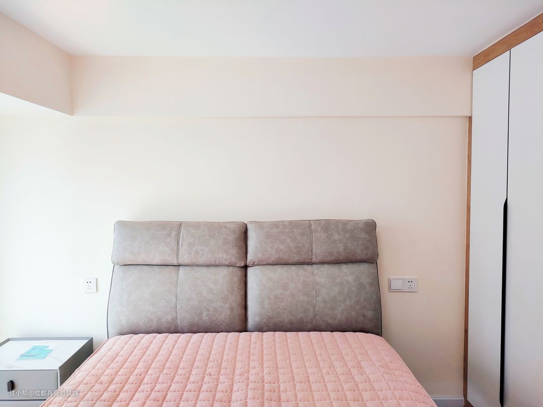 主卧,设立在阁楼上,配备了衣帽间、休闲阳台、饮水区,功能考虑得很齐全,生活起来也更加便捷、实用。色彩上,运用淡粉色、简约白、原木色渲染空间,给人一种清新、明亮、自然之感。
