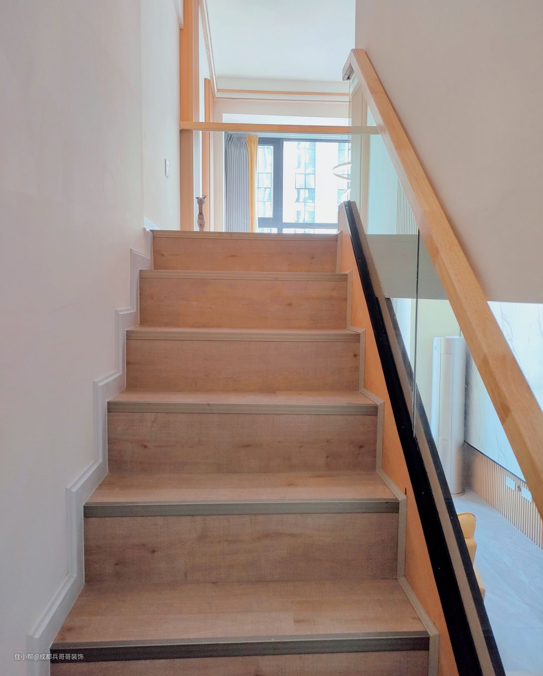 这套公寓采用的是原木扶手设计,搭配实木地板踏步,与整体风格相协调统一,氛围感更加自然和谐。