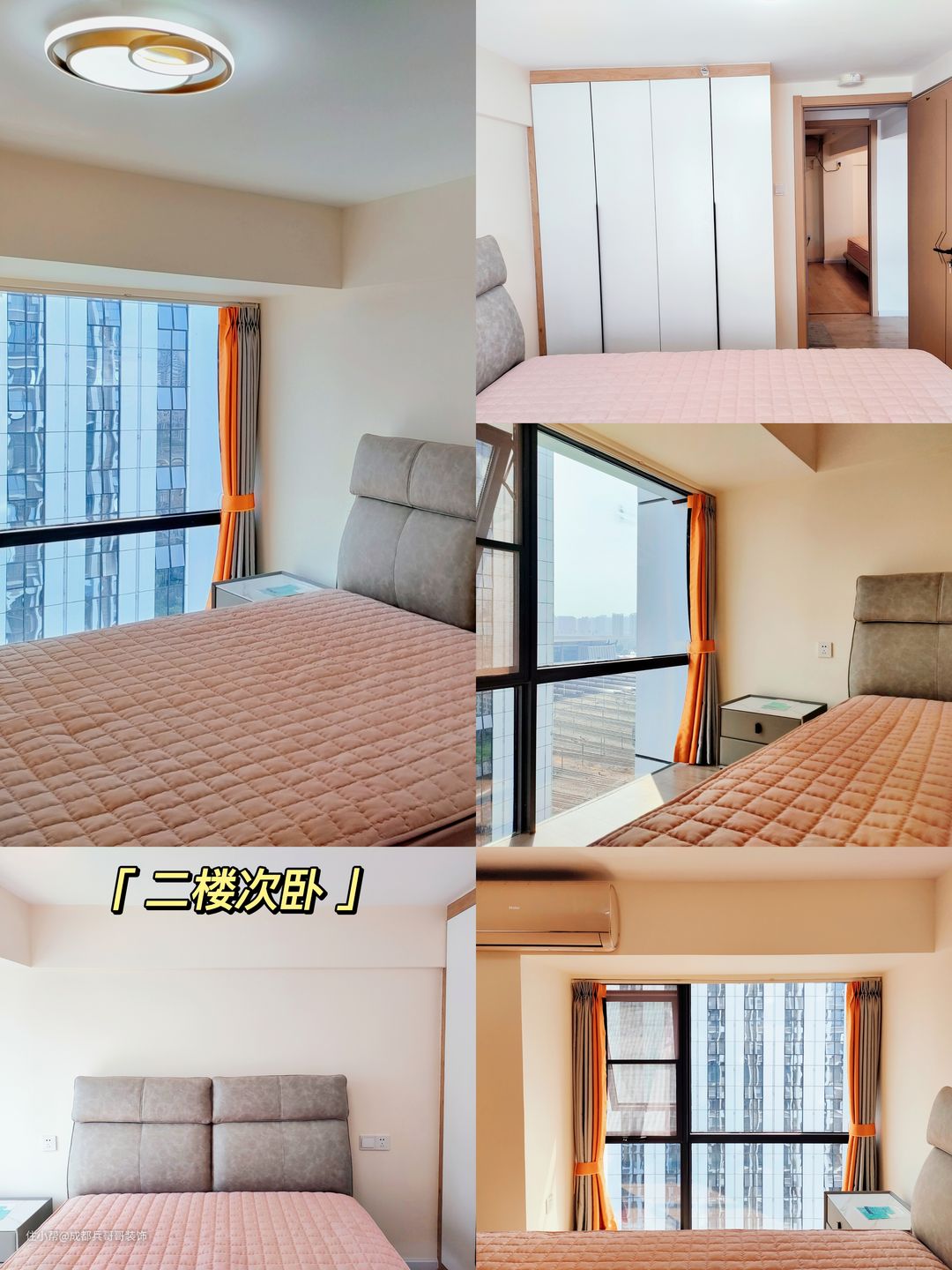次卧也安排在二楼,空间足够,设计师巧妙设计了落地窗,为房间带来了充足的采光,通风效果也不错。整体色调和主卧保持一致,视觉上协调性更好。
