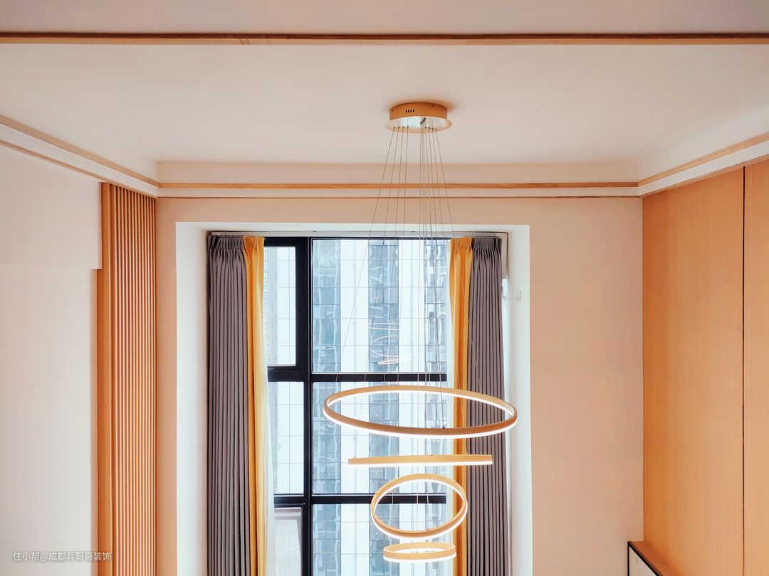 首先呢,设计师将飘窗改造成日常休憩阳台,大面积落地窗为室内空间带来了充足的采光,通风效果也很好。其次,背景墙采用的是木格栅+花纹岩板+原木护墙板的整体设计,简约不简单,给人明朗清新的视觉感受。最后,灯光上,客厅正中间装饰了创意吊灯,错落有致的环形设计,赋予了空间无限想象。
