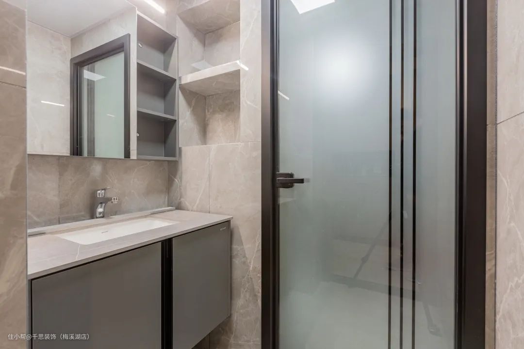 卫生间,干湿分离的设计,白色岩板大理石,大气,功能性强。低调奢华的隔断门尽显高端大气。