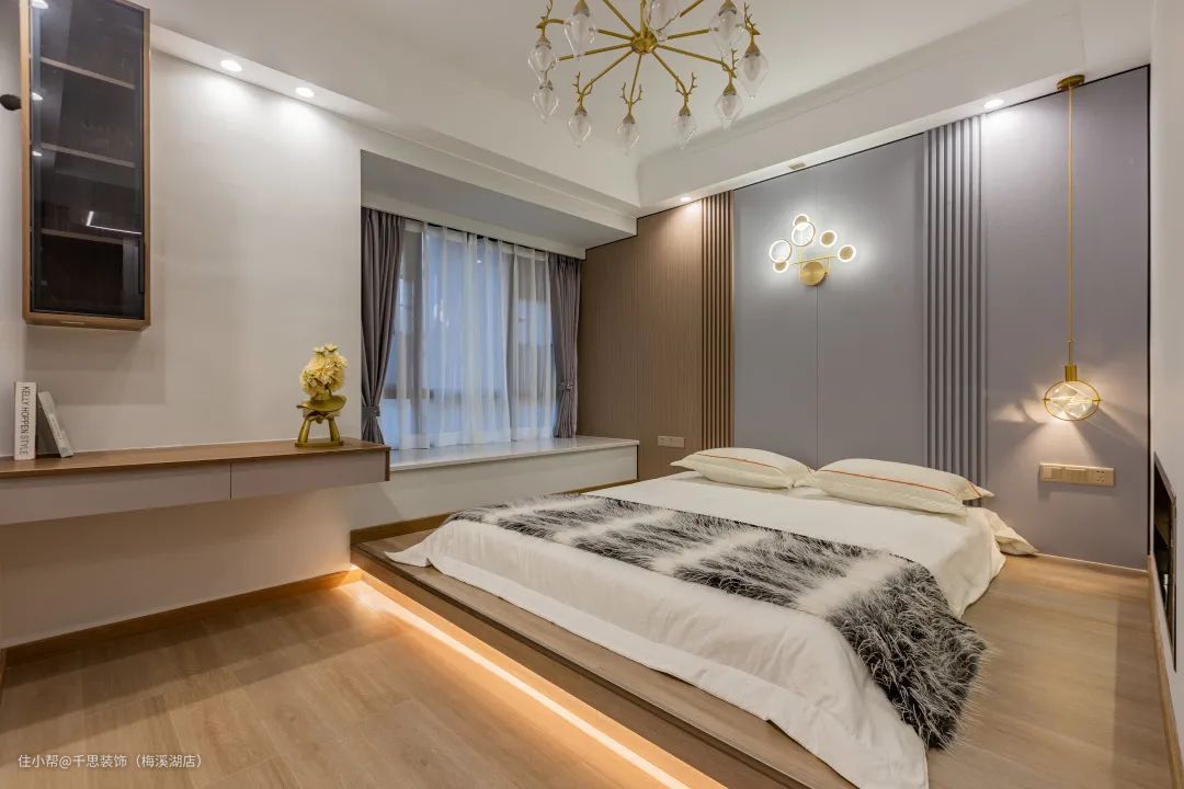 背景墙选择和客厅背景墙一致的设计,壁灯+吊灯双层辅助照明,营造一个浪漫安静的睡眠环境。