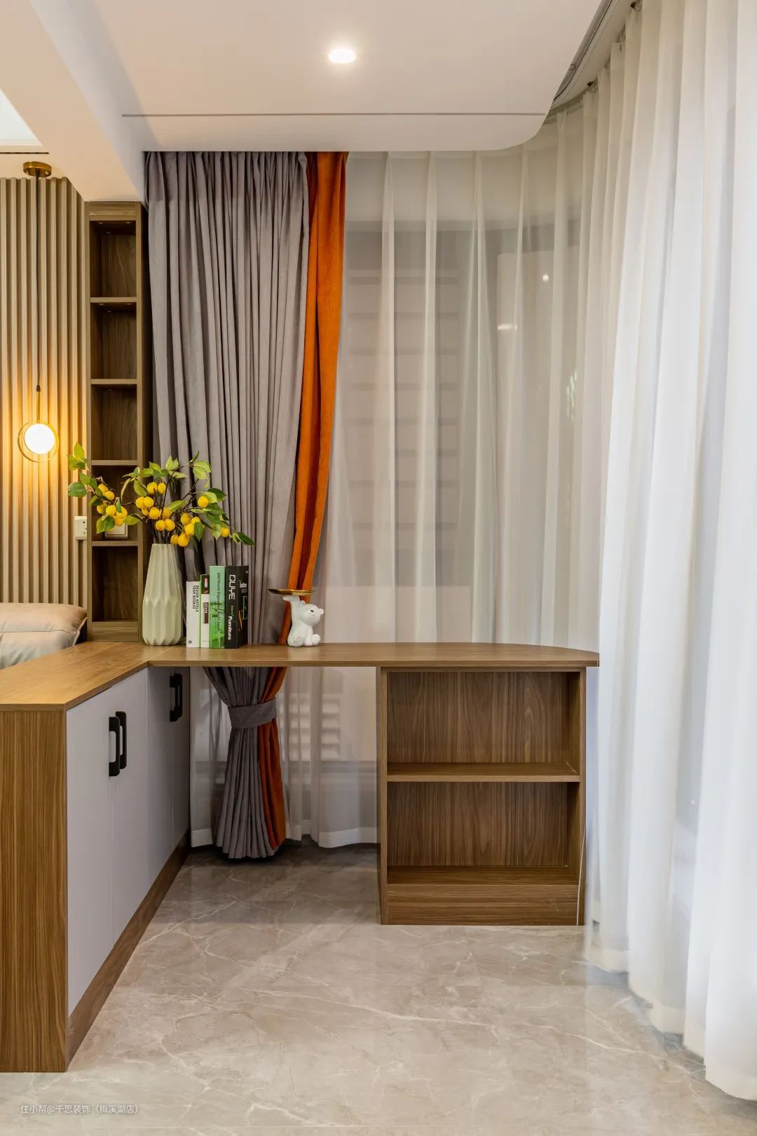 阳台,在沙发一侧定制了一款简便的书桌,合理地区分了客厅和阳台空间,同时也可以作为书桌使用,上面摆上一些绿植或者书籍,可随时翻阅。