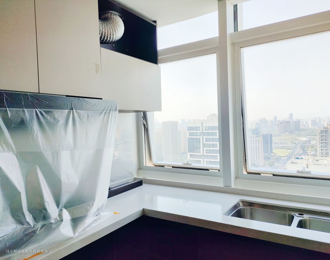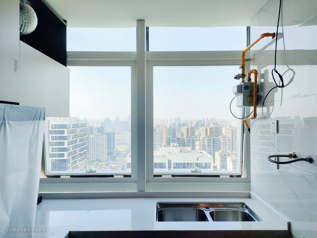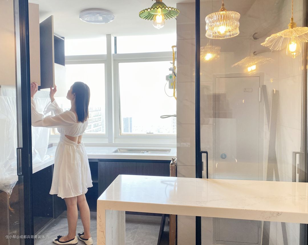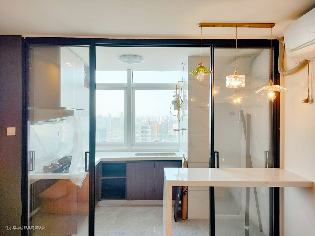厨房,整体是L型设计,推拉门选用的是吊轨式设计,方便日常清洁打扫,房间采光效果也更好。