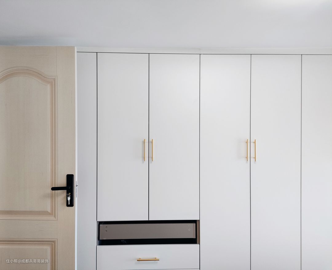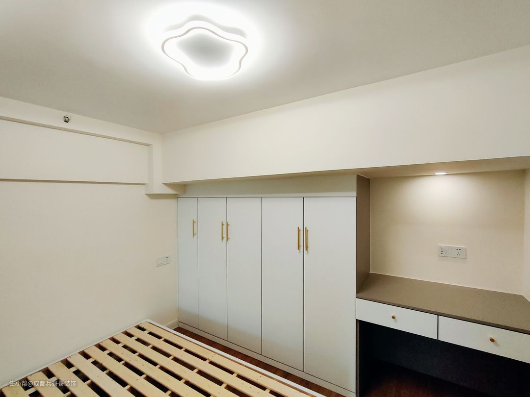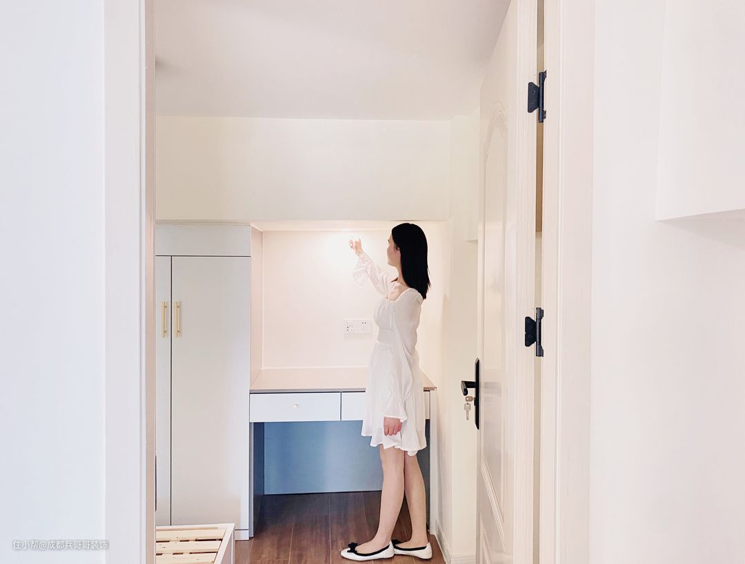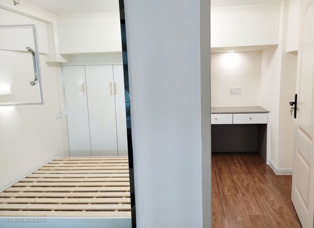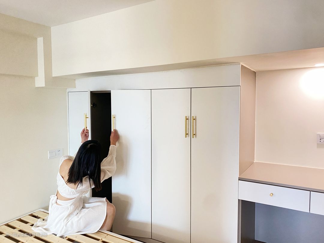 值得一提的是,房间内有大梁,很大程度上压缩了空间,但设计师巧妙将其利用了起来,在梁下设计了书桌和储物衣柜,犄角空间瞬间完美呈现在眼前,让人一眼便喜欢🥰