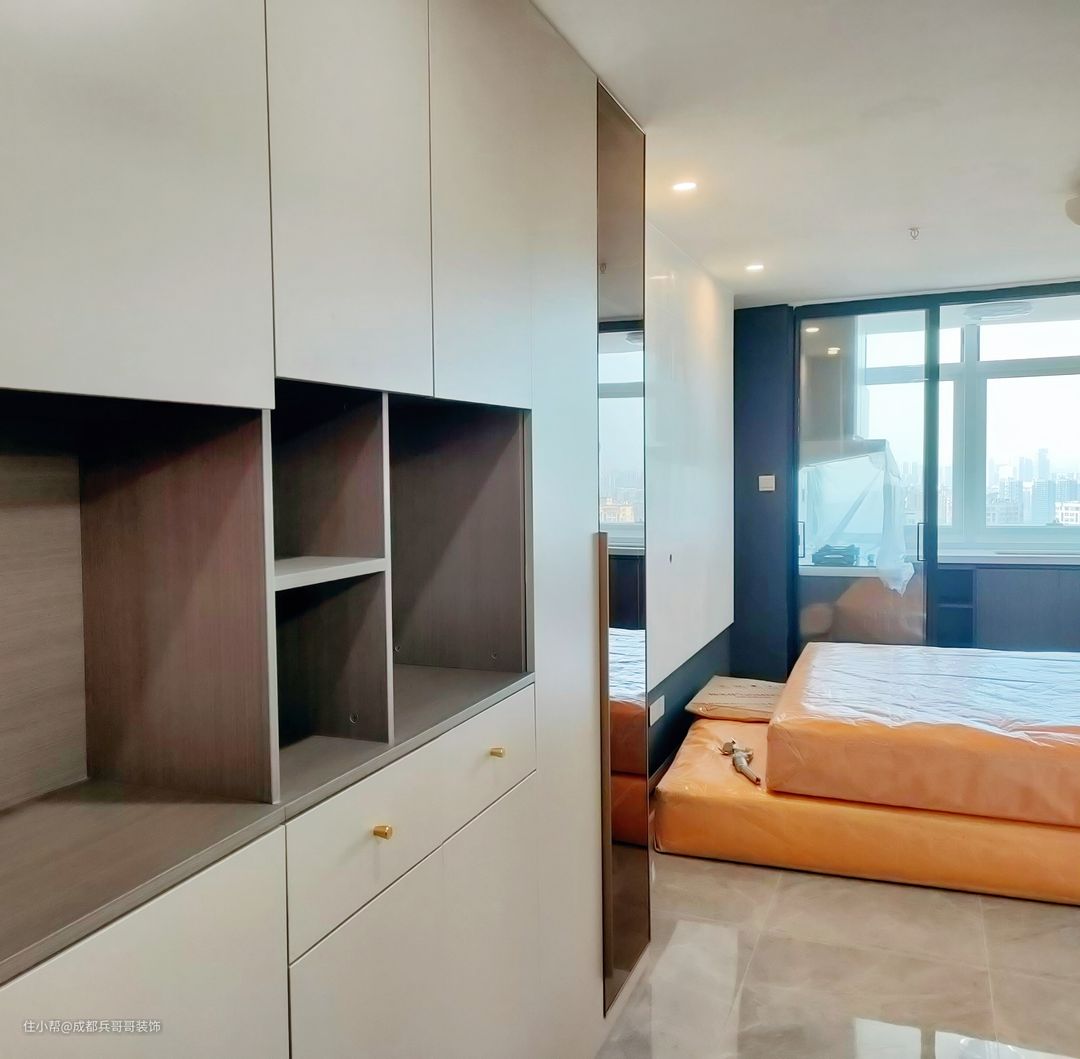 房间里,摆放了一张1米8的大床,一侧墙面设计的时通顶衣柜,内含挂衣区、叠衣区、隐藏式储物区,收纳功能齐全,生活起来十分方便。