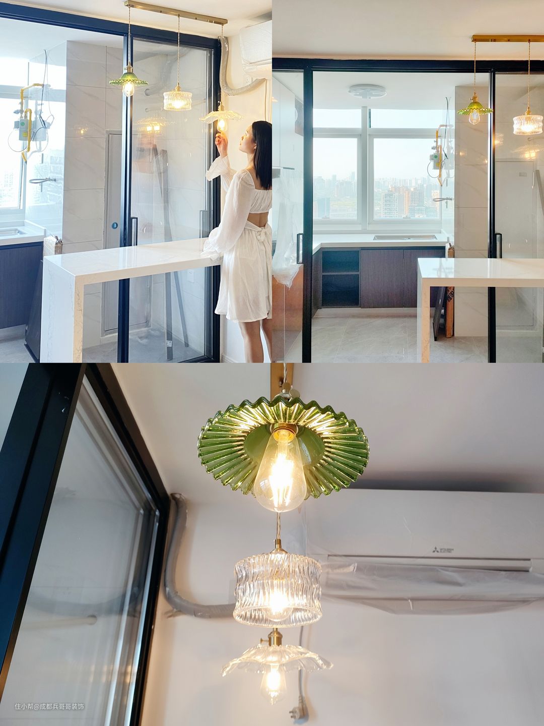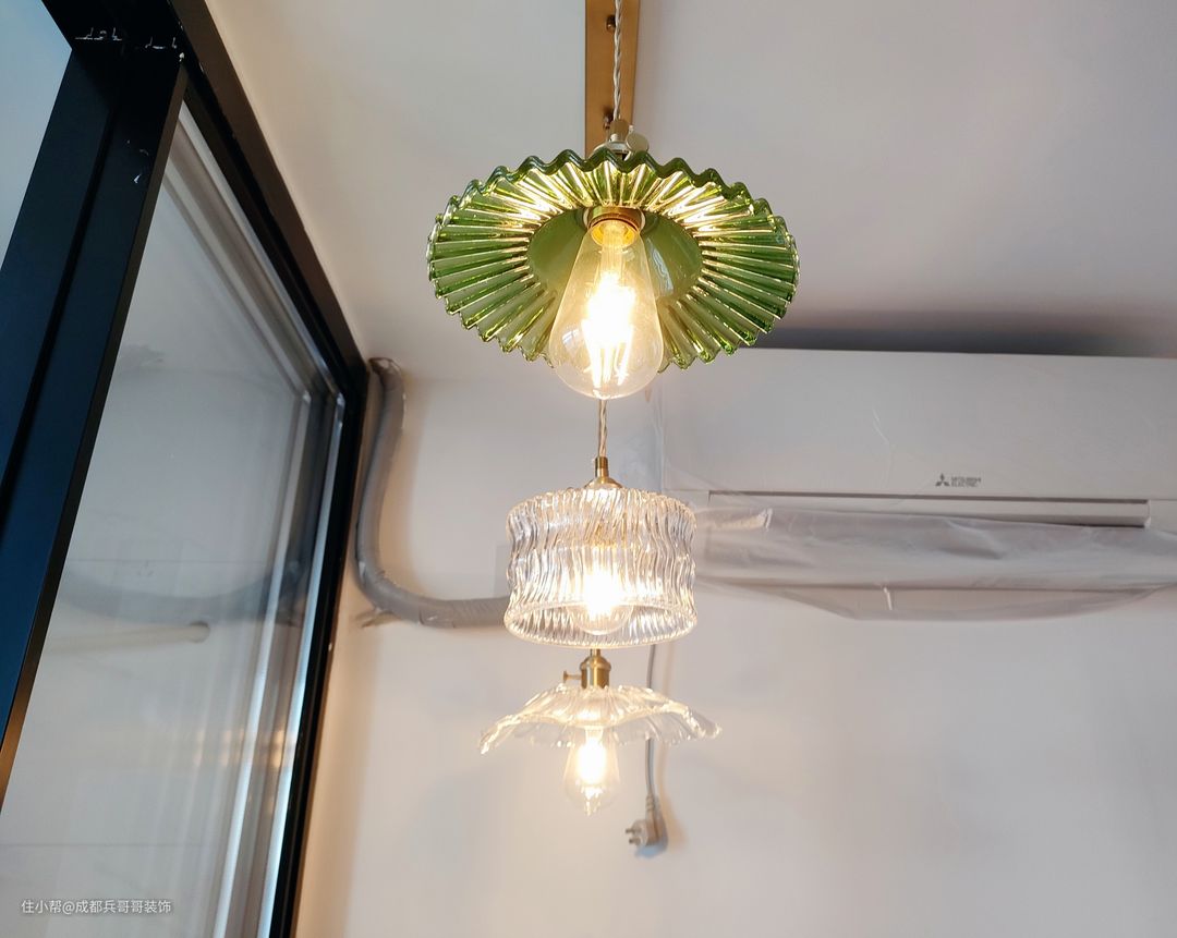 为了缓解空间的单调,设计师特意在灯饰上花了小心思,选用了抹茶绿和白色水晶创意灯,让空间色彩更加丰富,氛围感十足。