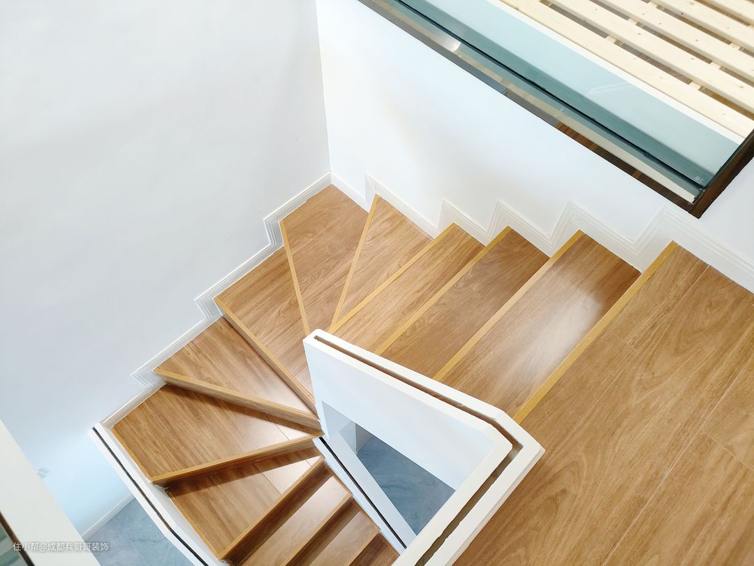 楼梯间,采用旋转式楼梯设计,原木风格布局,玻璃扶手卡槽设计,完美连接一二楼空间,舒适自然。