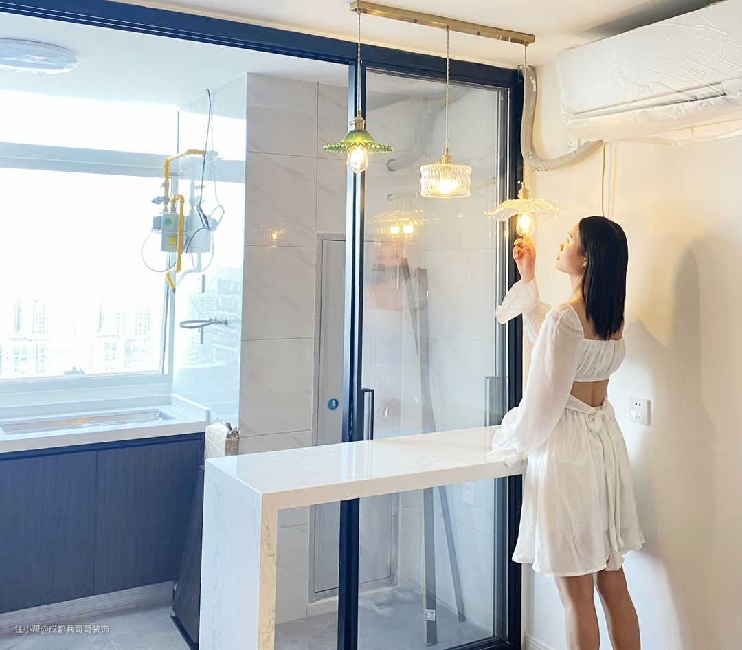 餐厅,由于屋主是90后的小情侣,前期设计了一个简易的餐吧台,后期如果人员增加,可以定制成品的餐桌放在客厅中间,节省空间的同时,还能满足功能性的使用,一举两得哦~