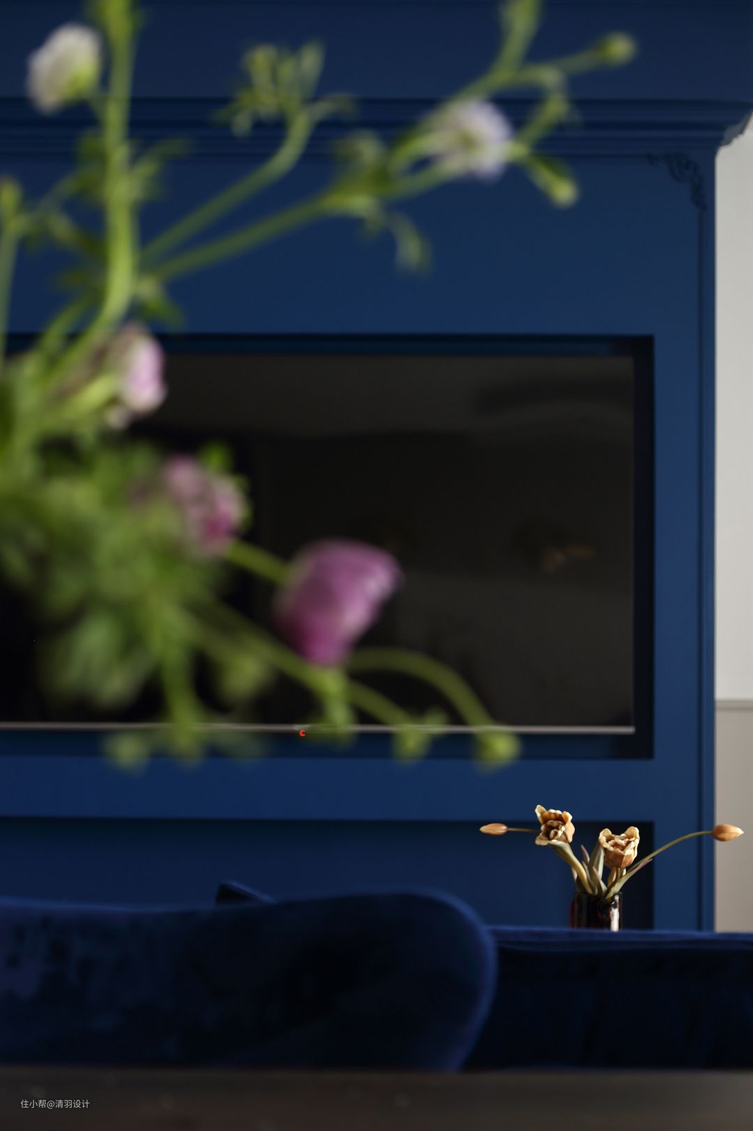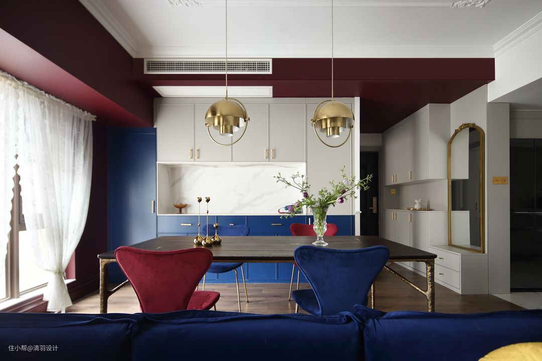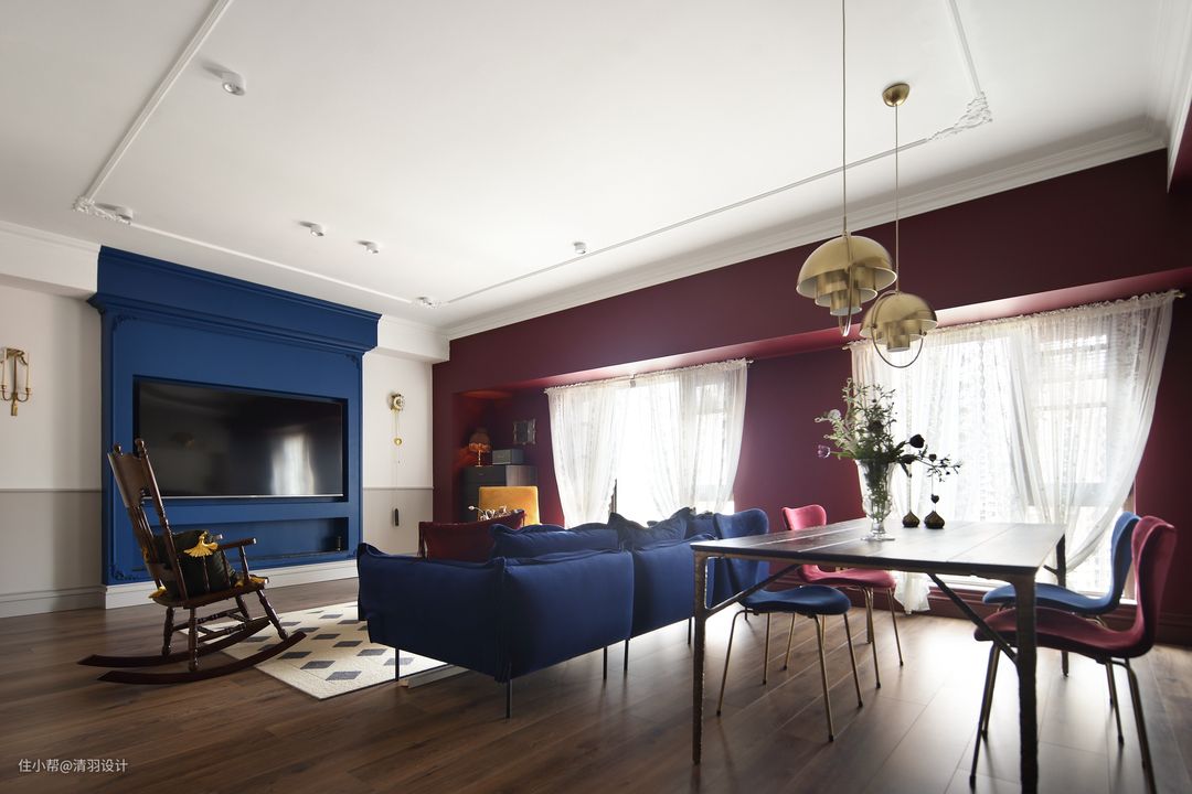客厅以大面积白色墙面,搭配蓝色电视背景墙和部分红色墙面,再用一点点的黄色、蓝色软装调配其中。几个色块通过巧妙分割和组合,使优雅沉郁的空间变得动感,节奏性十足。