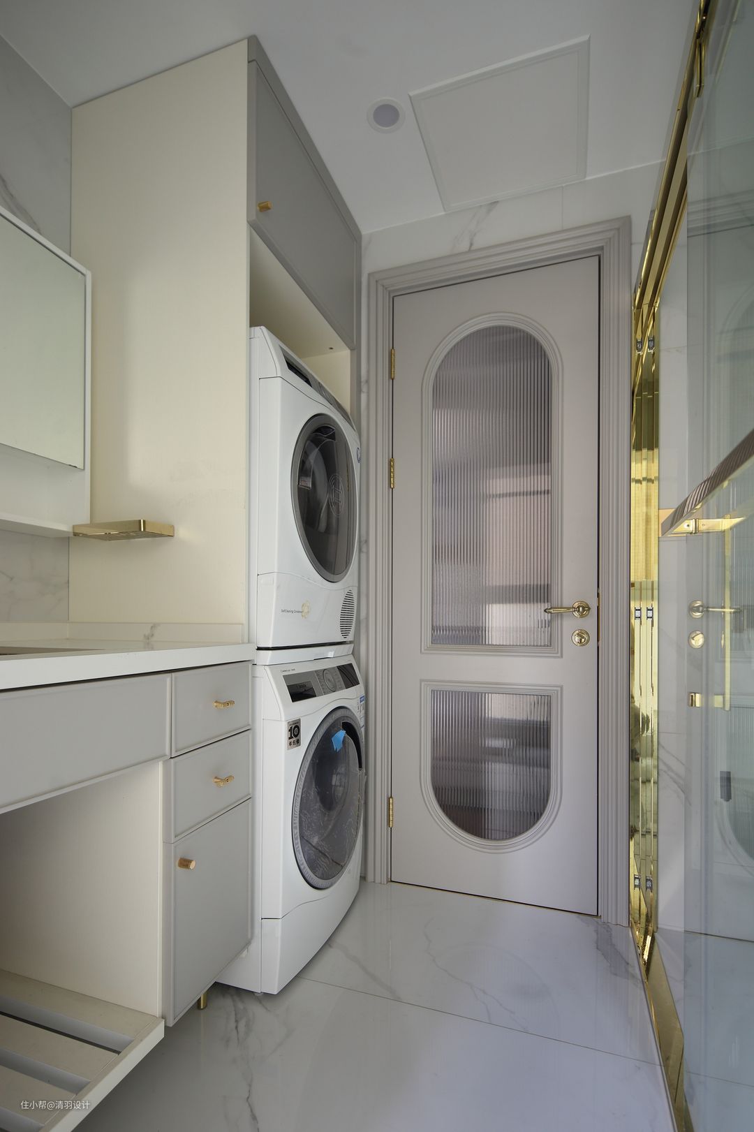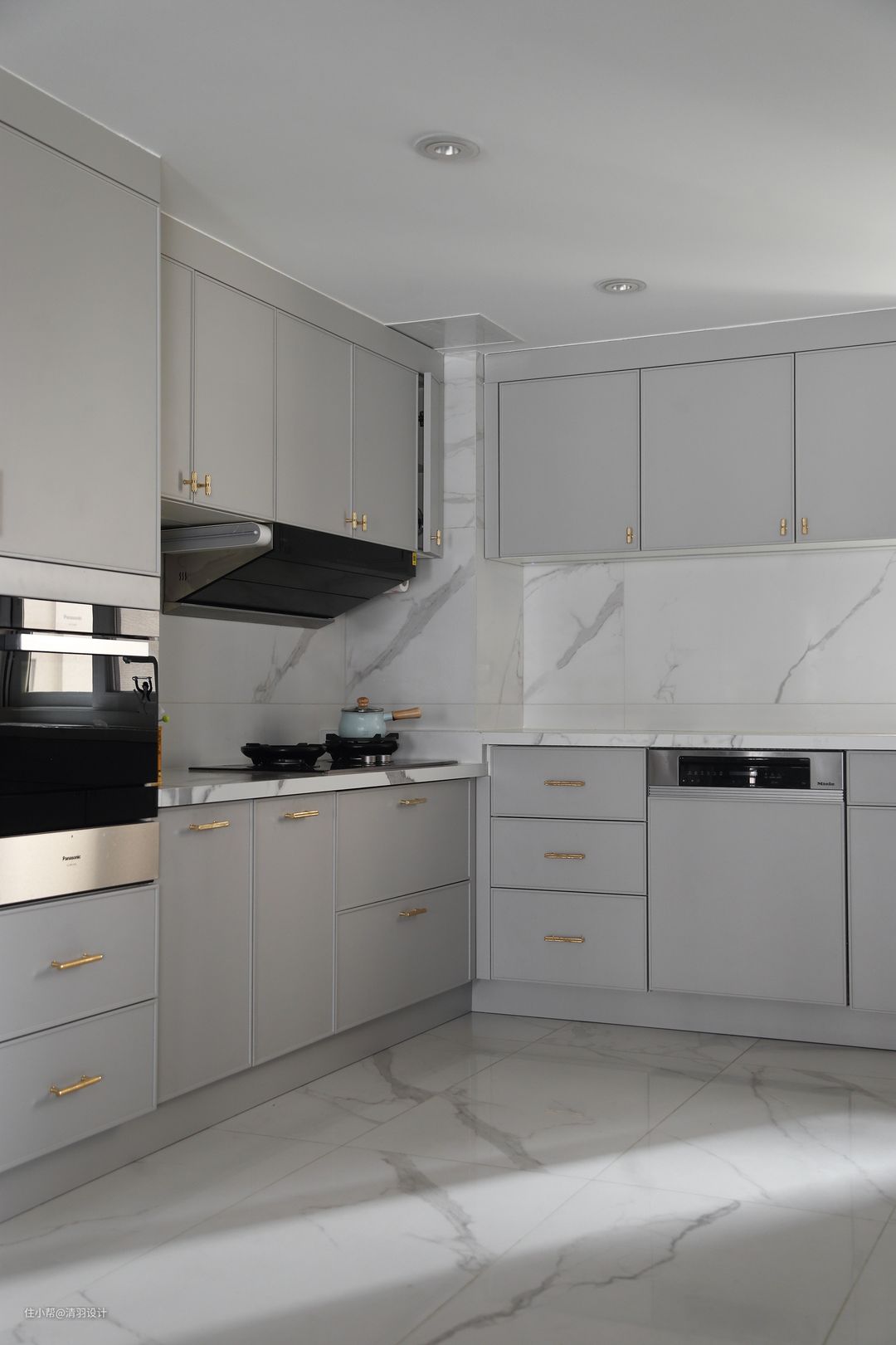 原厨房中规中矩,设计师宋夏应男主人要求打掉了几面非承重墙,将餐厨格局重新构建,利用开放式厨房设计连通餐厨区,让U型厨房物尽其用。 白色花纹大理石墙面与地面自成一体,奶油灰橱柜现代极简,嵌入式厨电在保证功能性的基础上,让整个厨房显得大气简洁。