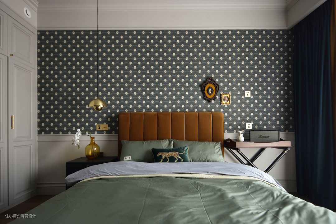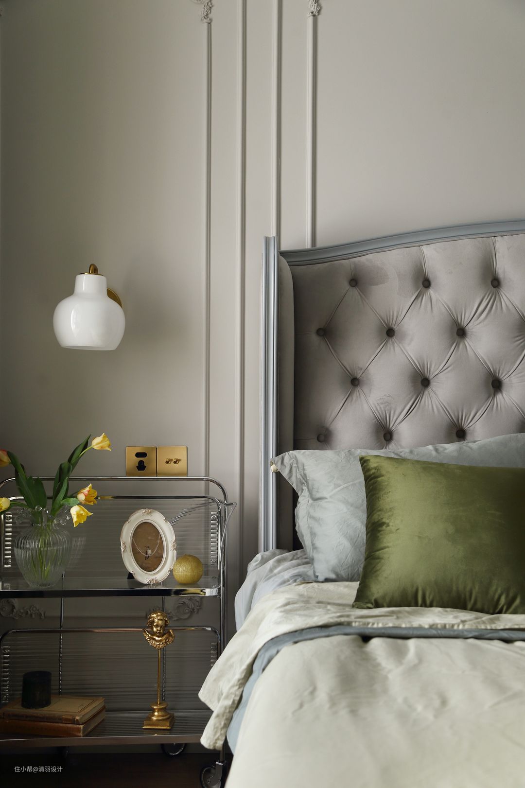 而她心爱的卧室正将这两点进行了融合,稍作线条的吊顶和墙面打造出法式家居特有的优雅与温馨;浅杏灰的墙面与定制柜在颜色和造型上也保持一致。