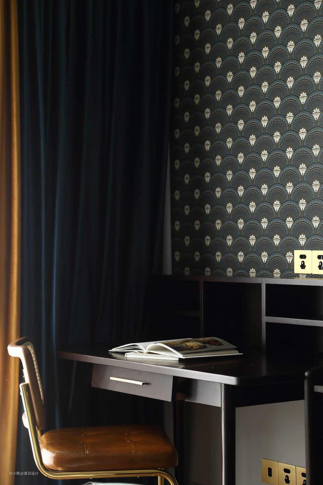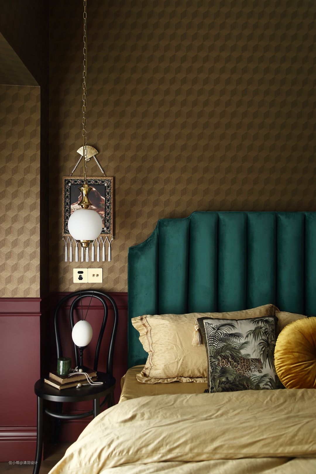 次卧采用深色系的低调设计,满足长辈的审美眼光。以单椅或边柜替代床头柜,同样令人眼前一亮。