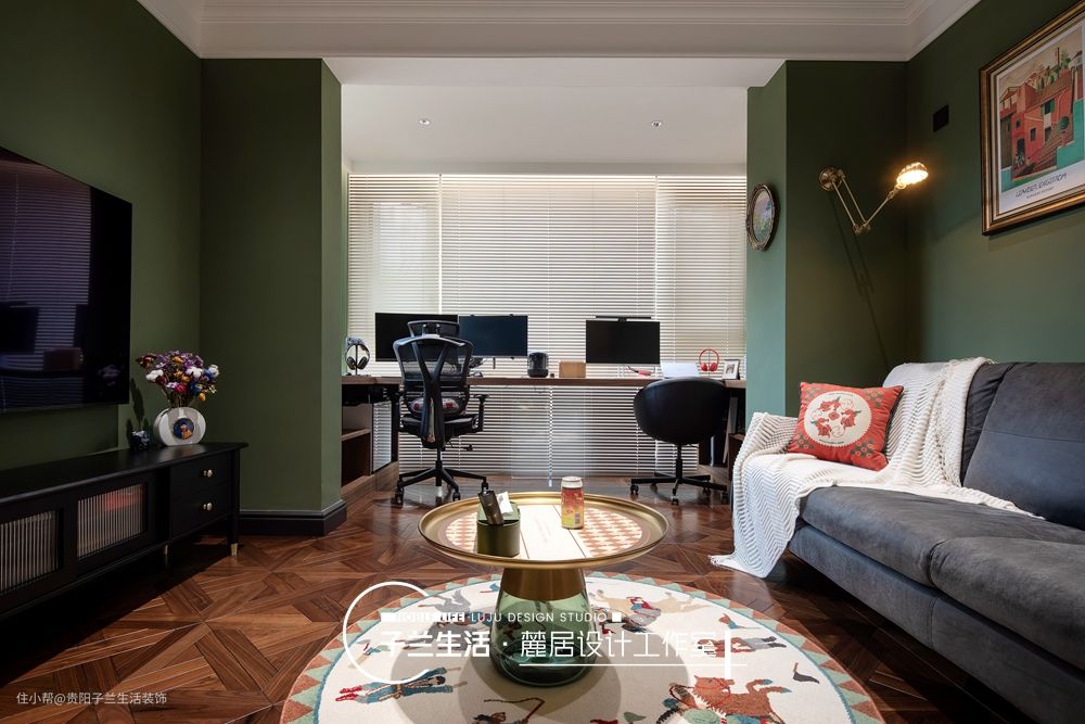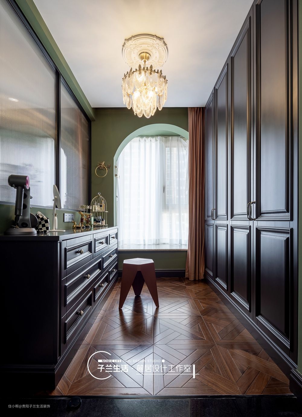 墨绿色与珊瑚红之间的大胆撞色,是过道空间的点睛之笔。珊瑚红半墙上,缀以一组法式艺术挂画,将复古气质拉满。