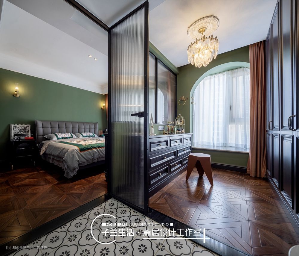 为保持空间的贯通,450x450的拼花地板,延续至主卧和衣帽间。这款地板是千挑万选出来的,为了契合空间的复古气质,特意选择了这款线条感与纹理感比较足的拼花地板。