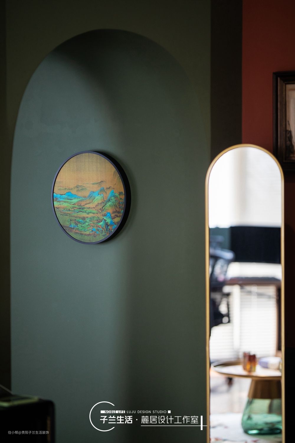 墨绿色拱门内,一幅《千里江山图》圆形装饰画,传达出宁静而深邃的艺术境界。