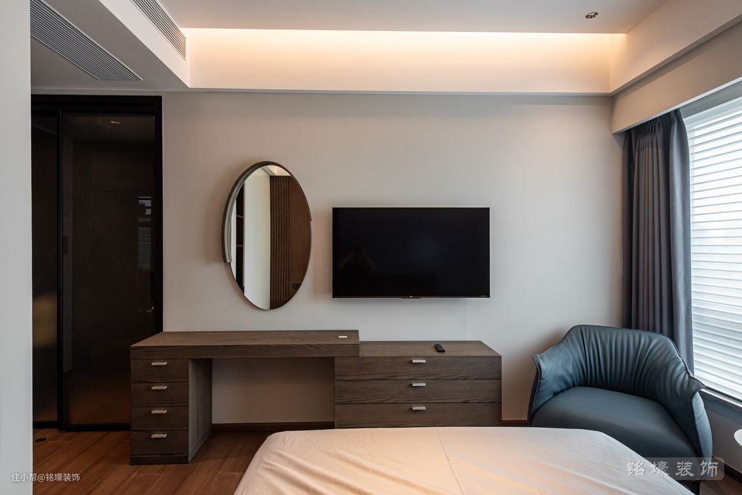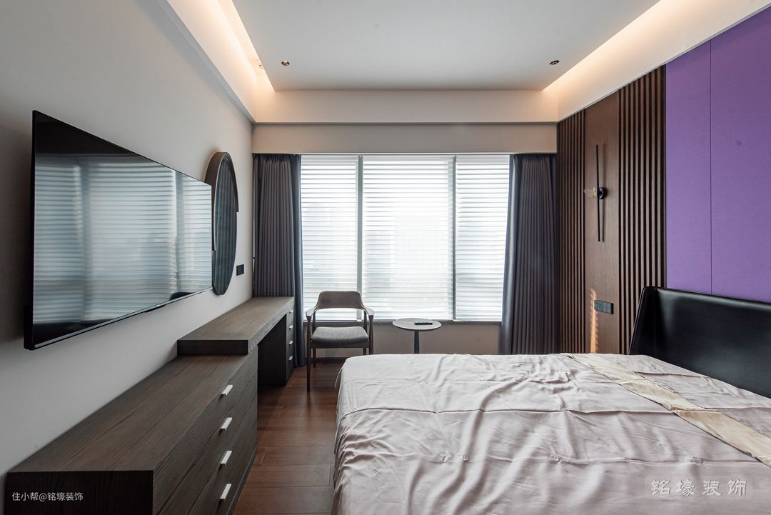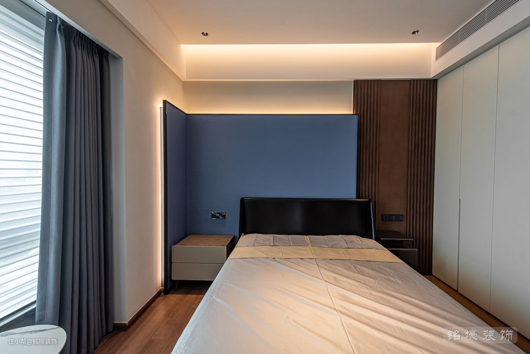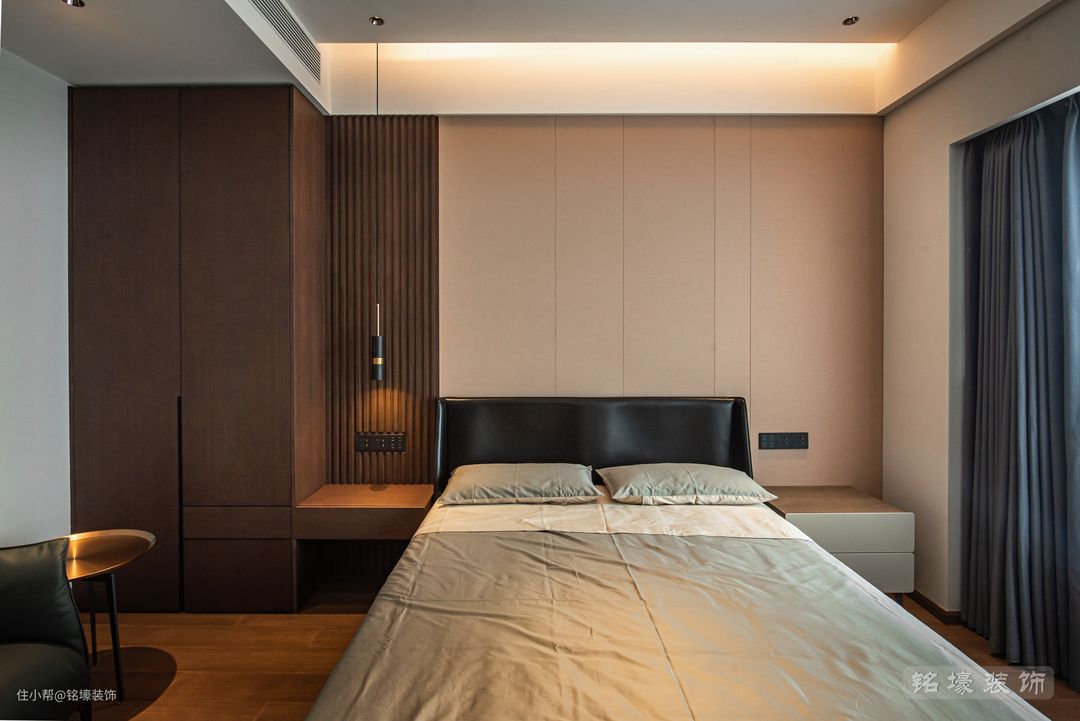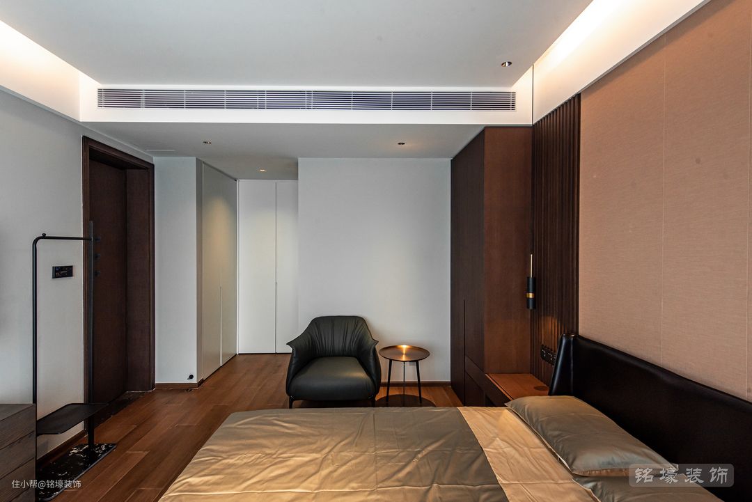 男主人的卧室,整体风格与公共区域一致——现代简约,但又通过木地板、木格栅等元素的使用来达到男业主追求的沉稳效果。