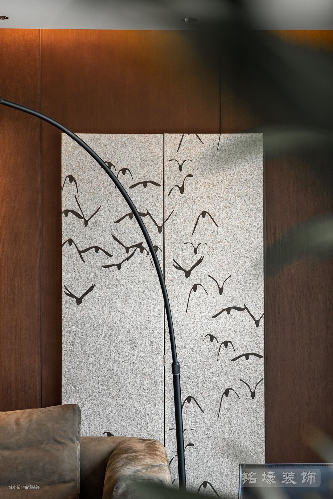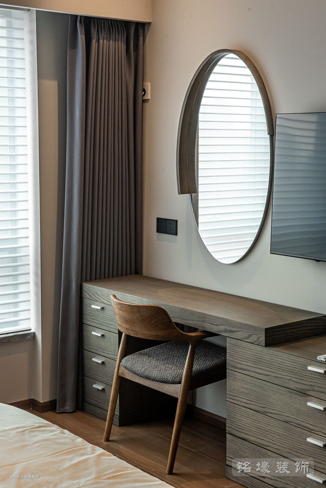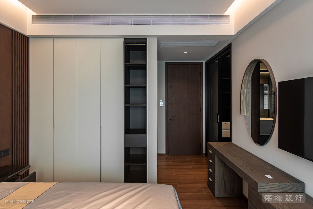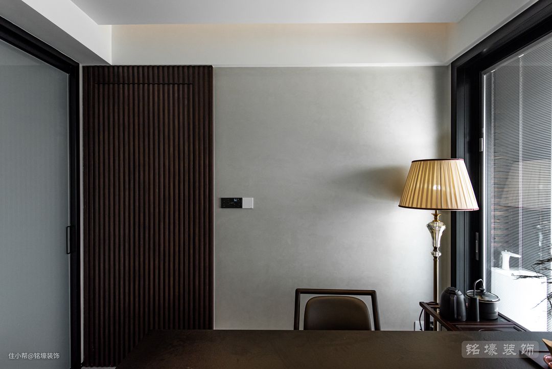 男主人的卧室,整体风格与公共区域一致——现代简约,但又通过木地板、木格栅等元素的使用来达到男业主追求的沉稳效果。