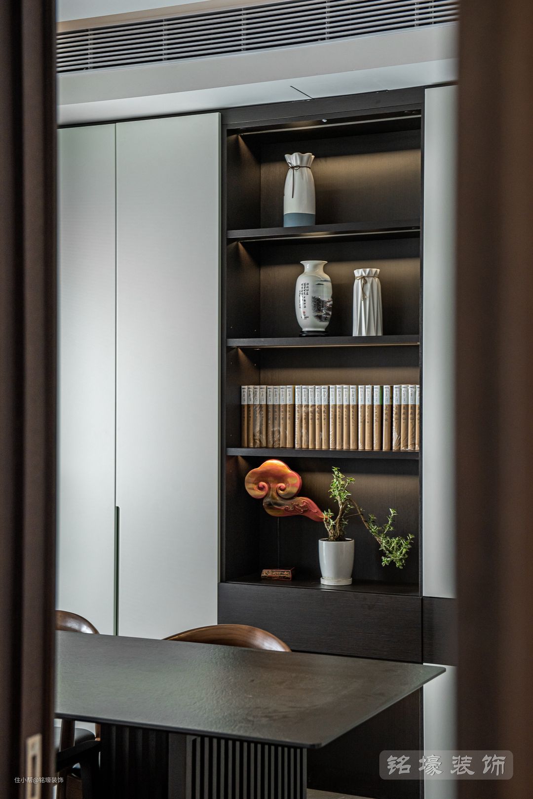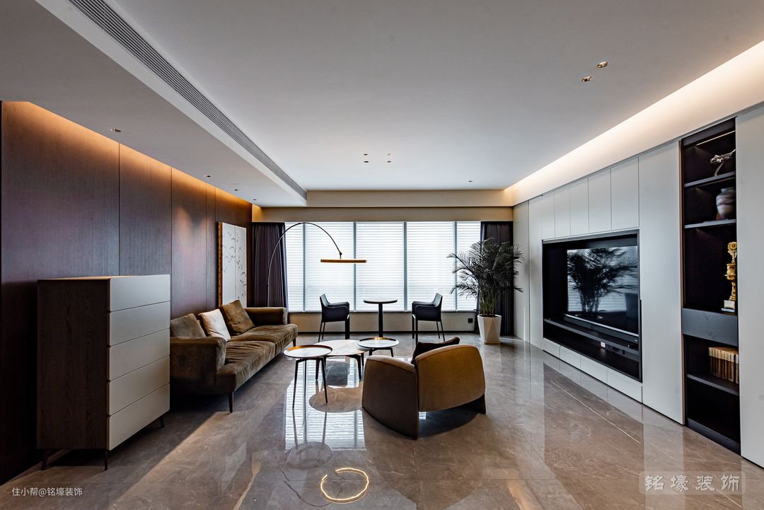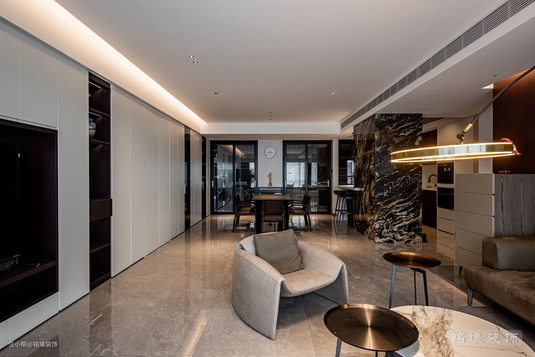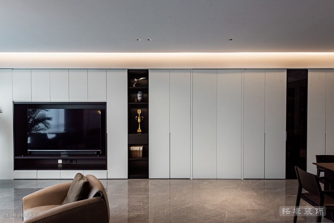 要实现整洁简约的视觉体验,系统充足的收纳空间是一大关键。在电视背景打造一整面的白色收纳墙,分隔客厅与卧室区域的隐形门也藏于这一整面的收纳墙中,存在感被最大程度地削弱,空间整体性和私密感更强。