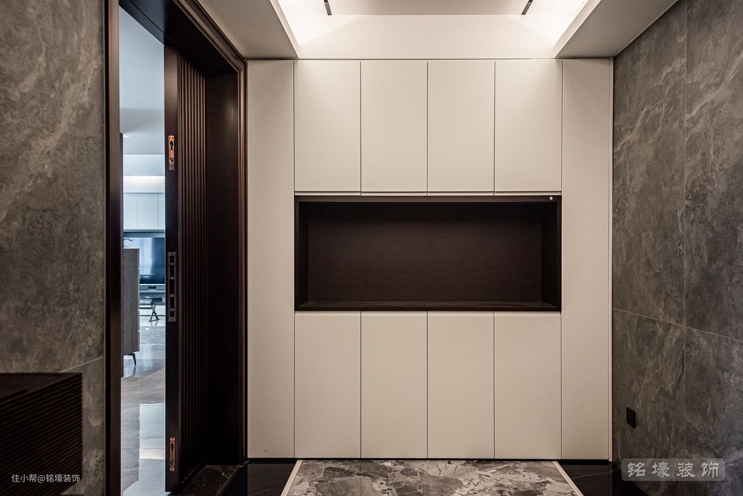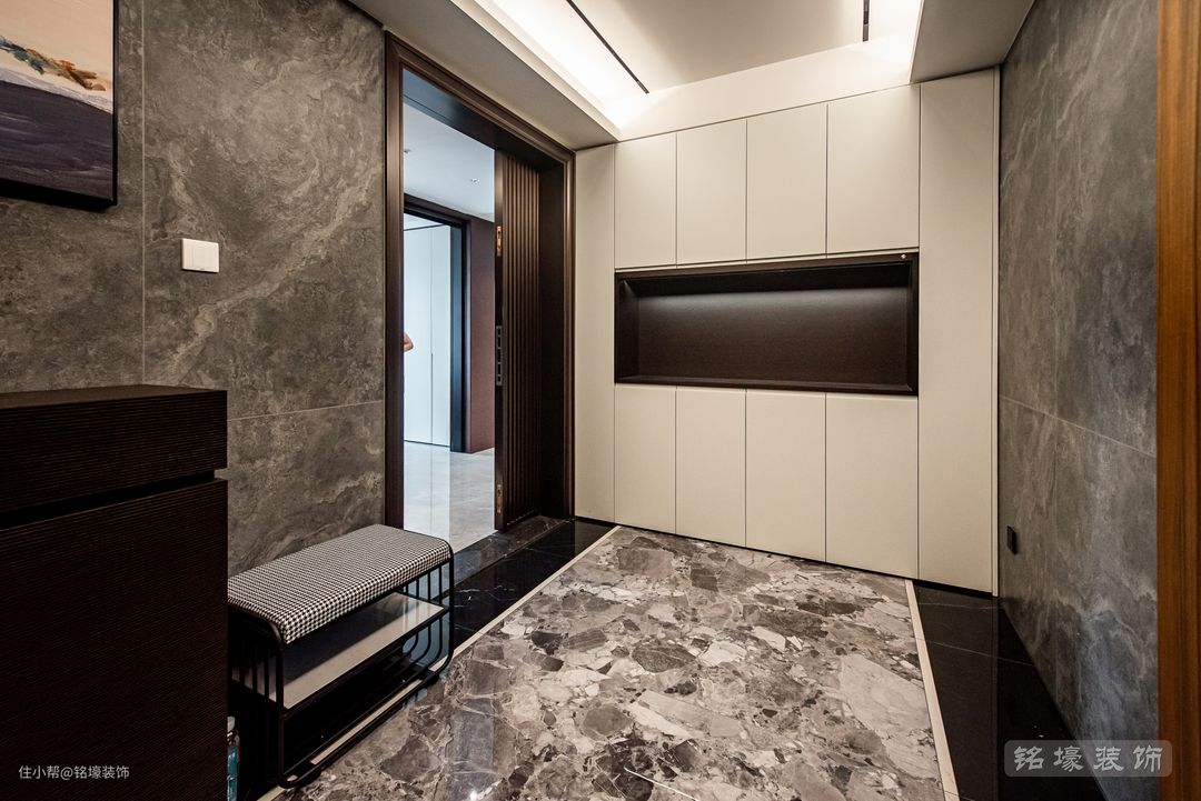 男业主对家的设计很有自己的想法,他认为玄关是个非常有仪式感的空间,它既是出门前最后一个待的地方,也是回家时迎接我们的“门面担当”。 业主对玄关的要求是色调偏暗,这样在进入真正的家居空间时才会有“豁然开朗”、眼前一亮的感觉,实现外部空间切换到内部空间的仪式感。墙面铺贴表面凹凸不平的哑光砖,给人以一种独特的“原始感”。