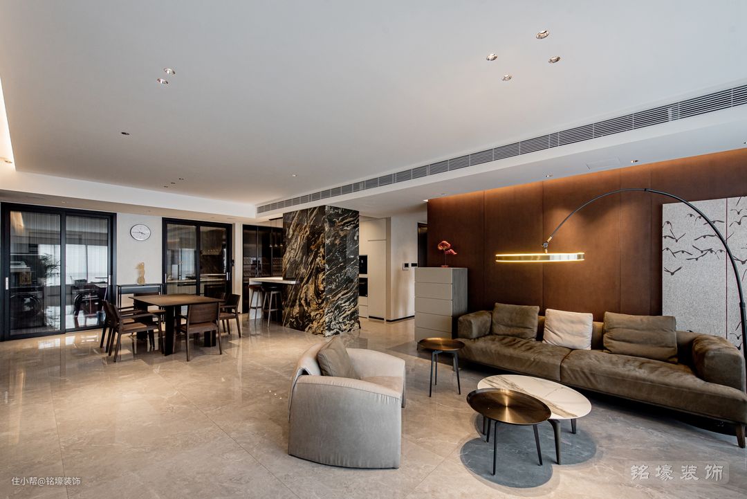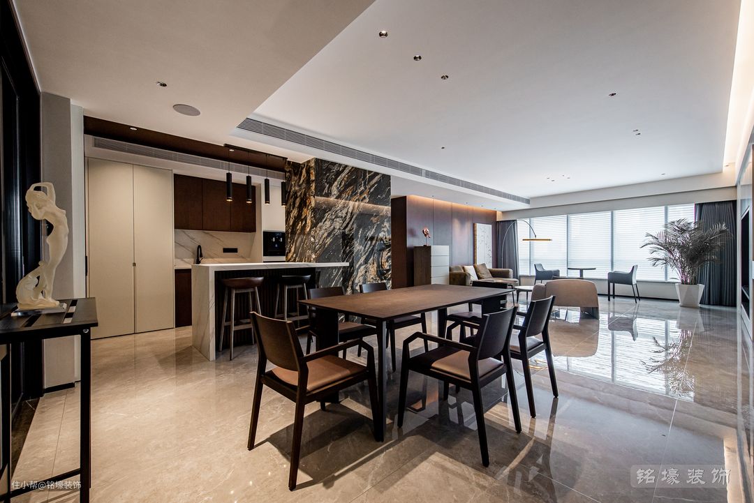 岛台旁原本的承重柱不太美观,设计师便将其改造成为设计性和装饰性更强的岩板柱子,这也成为整个家居环境的一大亮点。