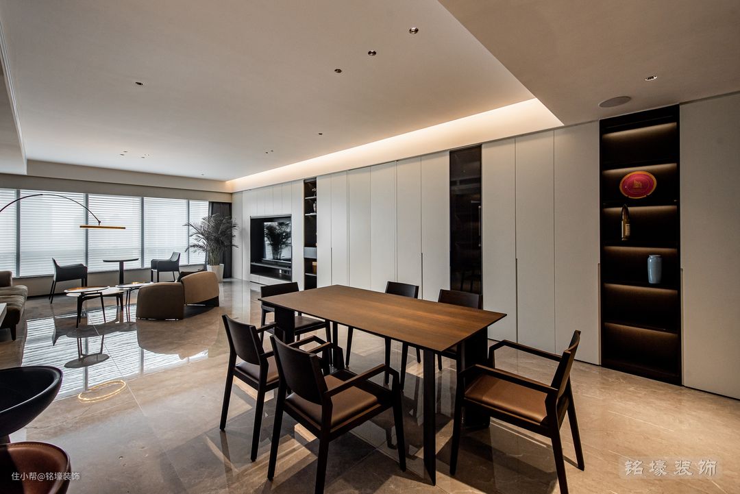 按照业主的生活习惯,西厨主要由酒柜、岛台、储物柜和操作台组成,一门到顶的设计最大化储物空间,酒柜采用透明玻璃门和暗藏灯带,提升空间质感。