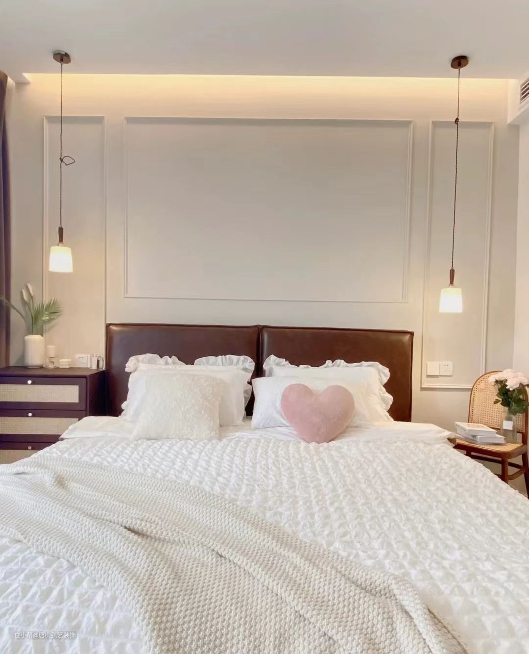 卧室背景墙床头刷的是很浅的奶茶灰色乳胶漆,搭配pu线条点缀,白色和棕色就是我家主卧的基调了,复古又纯净感。