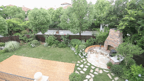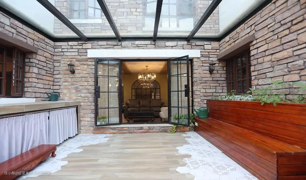 房子有着得天独厚的室外景观, 主卧阳台望出去是南花园, 李总在此设置了 户外壁炉、木平台、户外餐厅和水景区。 客厅一出门就是户外餐厅, 在这能清楚地到外侧潺潺的水流声。