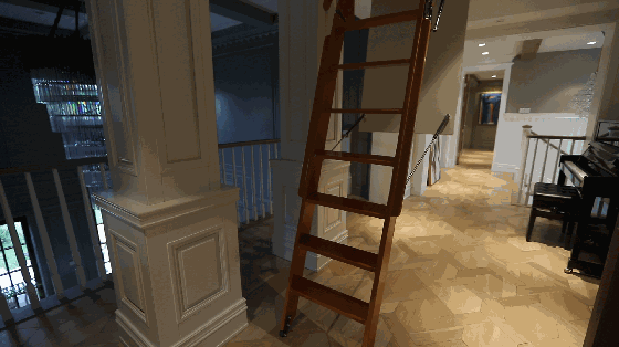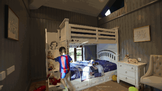 老爸特意给小宝留了一扇小窗,可以从上铺爬到阁楼。再从外面的梯子下来,小宝总是玩得不亦乐乎。