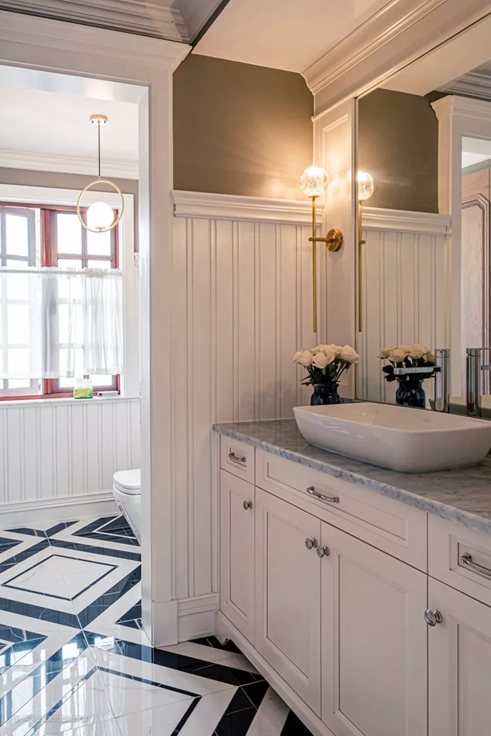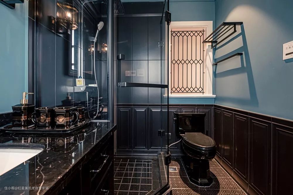 浴室,特意给哥哥选了酷酷的黑蓝配,黑色的护墙板砖费了好大劲才找到,刚好跟现代美式的风格相配。