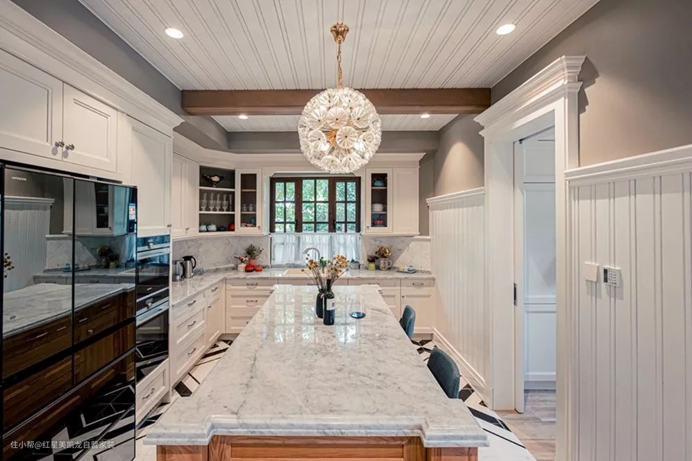 一楼有两个餐厅,这个是客餐厅,家里真正用得不多,另一个是家庭餐厅。↓ 西厨+卡座餐厅是家庭核心区