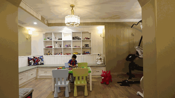 孩子的玩具间紧邻健身区,男主人可以一边运动健身,一边陪孩子。
