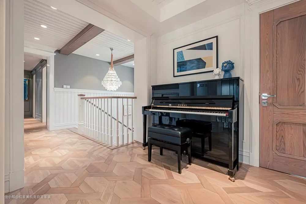 走廊是孩子们的乐园,弹琴、看书、玩ipad。本屋还藏着一个最大的彩蛋,走廊区做了吊顶,顶上藏了个小阁楼,是个超大储物空间。