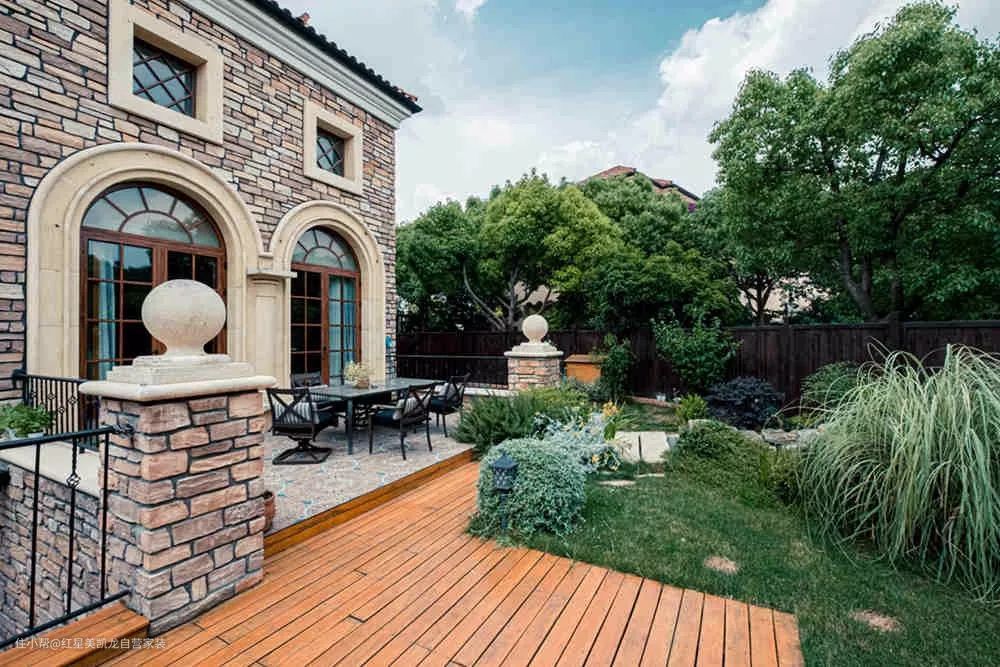 房子有着得天独厚的室外景观, 主卧阳台望出去是南花园, 李总在此设置了 户外壁炉、木平台、户外餐厅和水景区。 客厅一出门就是户外餐厅, 在这能清楚地到外侧潺潺的水流声。