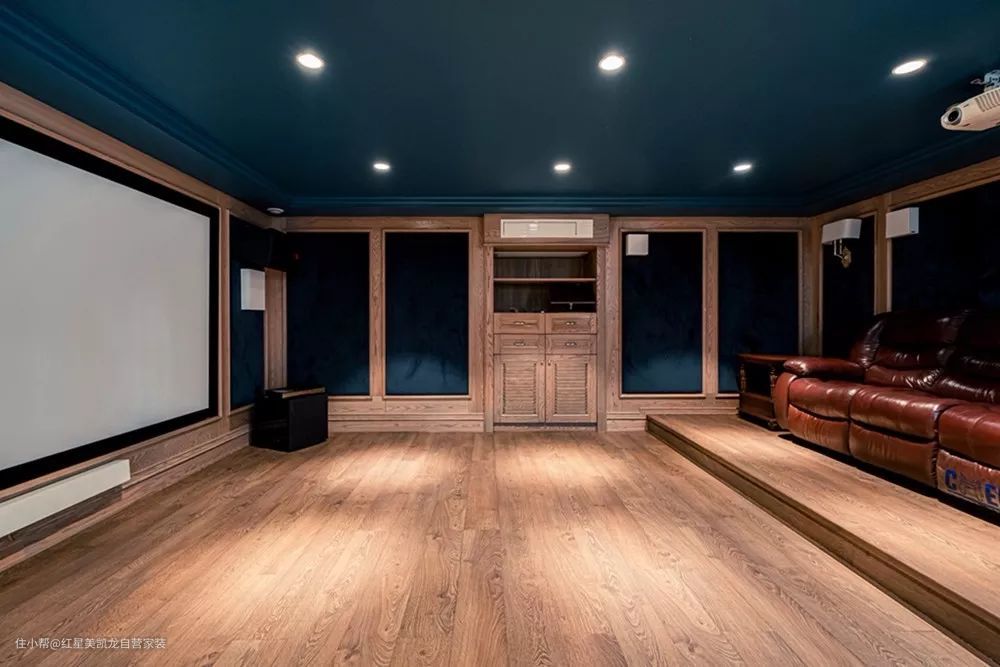 影音室大胆采用了深青色的屋顶,墙面用了蓝色丝绒软包,具有比较好的隔音效果,一家人有空可以一起在这看电影。