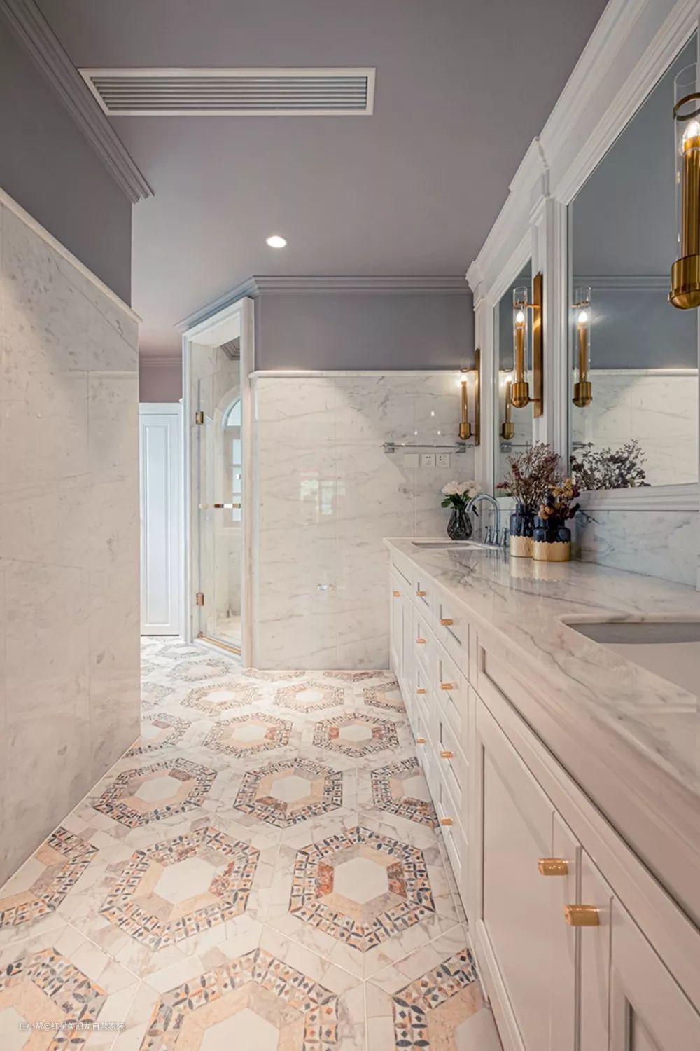 浴室双台盆设计满足两人同时使用,地砖、墙砖均选自红星真北商场的进口瓷砖。