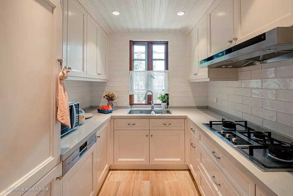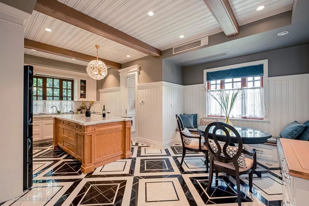 一楼有两个餐厅,这个是客餐厅,家里真正用得不多,另一个是家庭餐厅。↓ 西厨+卡座餐厅是家庭核心区