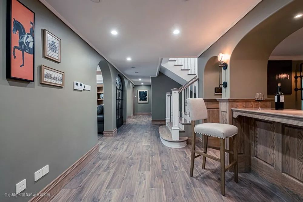 简单的吧台,内侧是藏酒室,尽管主人不太喝酒。 TIPS:干货分享 地下室防潮除湿是关键,一般人家因为潮湿会用地砖,而这个家中铺的是木地板,由于底层做了防水、隔热层,同时配备中央除湿设备,可以保证室内恒温恒湿,使用起来非常舒适。