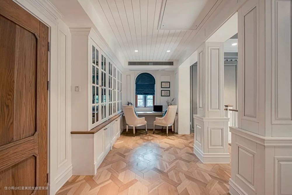 家庭餐厅,不仅是一家人围坐吃饭的空间,还是妈妈陪孩子下棋、玩拼图、写作业的地方。 TIPS:干货分享 餐厅处实木护墙板的工艺是最难的,墙上宽窄不一的竖条,全部由木工一块一块现场加工拼装上去,难以想象整屋大量的实木板,光是从整车的木板中找出来放到对应的空间,工程量惊人。就如同一个巨型的拼图,考验木匠的耐性。 实木容易热胀冷缩,还要特别留出伸缩缝,这样未来不至于出现膨胀开裂等现象。