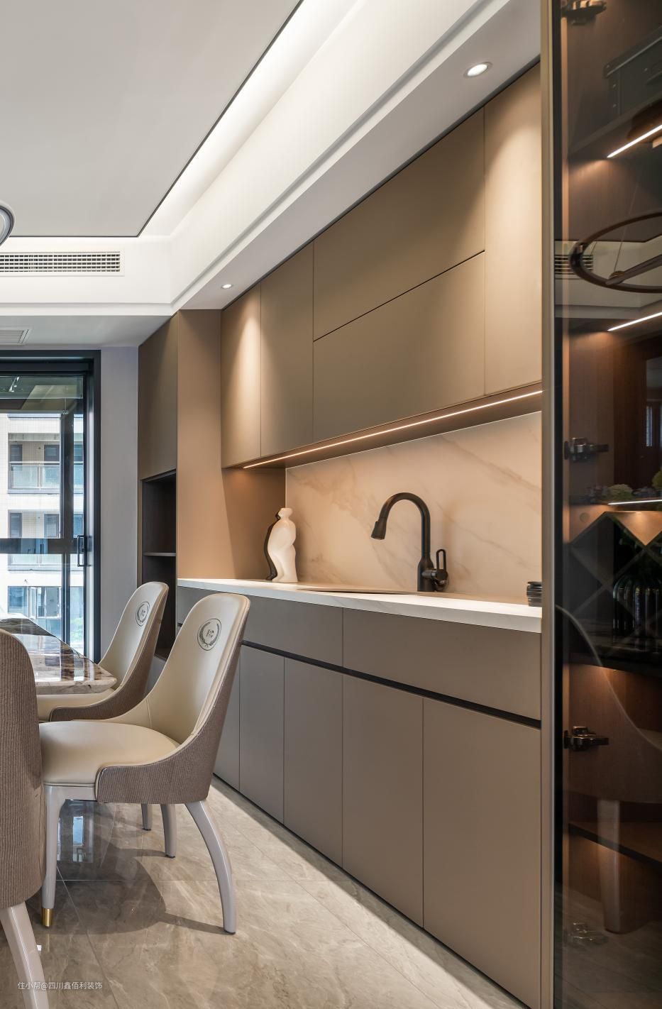 设计师利用空间的宽度,将其中一方打造成了西厨区,以此作为厨房功能的扩展与延伸,同时也为热爱烘焙的男主提供了充足的场地。吊柜下方的灯条设计提供细致化的考量,让洗菜备菜的舒适度大大提高,一侧酒柜内摆置了收藏的红酒、艺术雕塑等,为业主提供一个舒心随意的闲趣逸致生活环境。