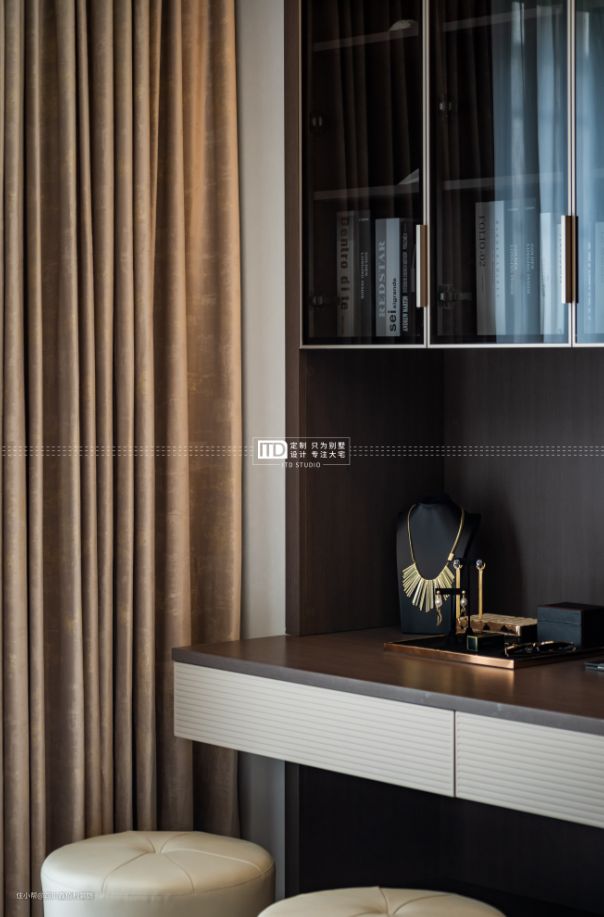 设计师充分利用户型结构,规划了步入式L型衣帽间,定制到顶衣柜可以让收纳力翻倍,开放式+封闭式组合设计,层次丰富,灵活性和私密性同时具备,局部采用玻璃柜门颜值更高,碾压传统衣柜,再搭配内嵌式灯带,衣帽间瞬间质感提升。