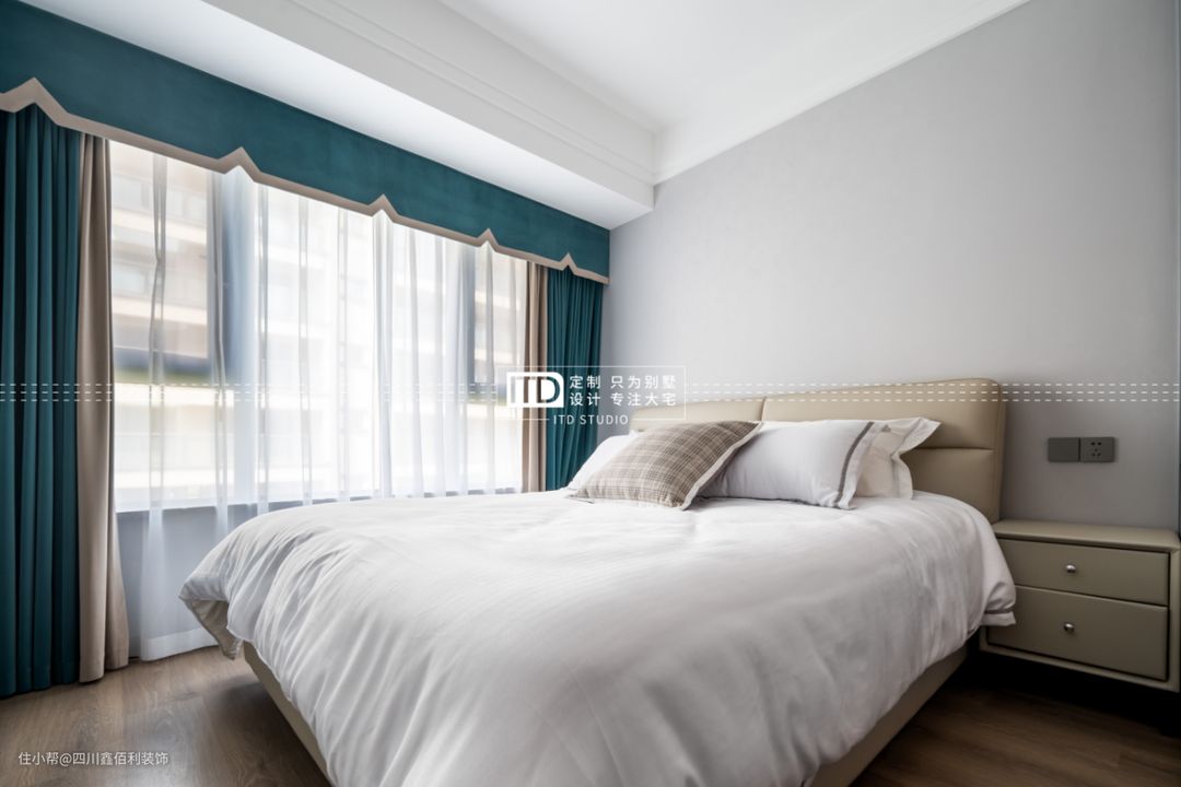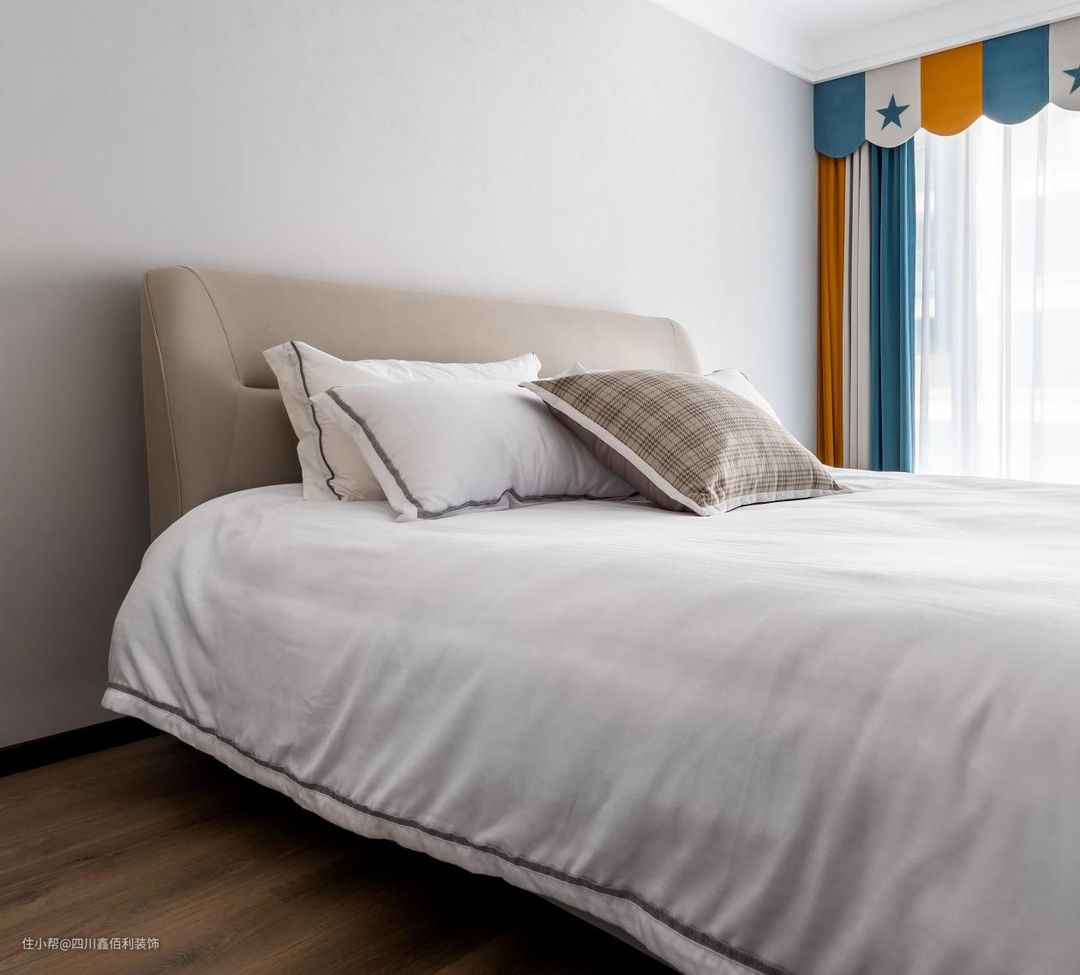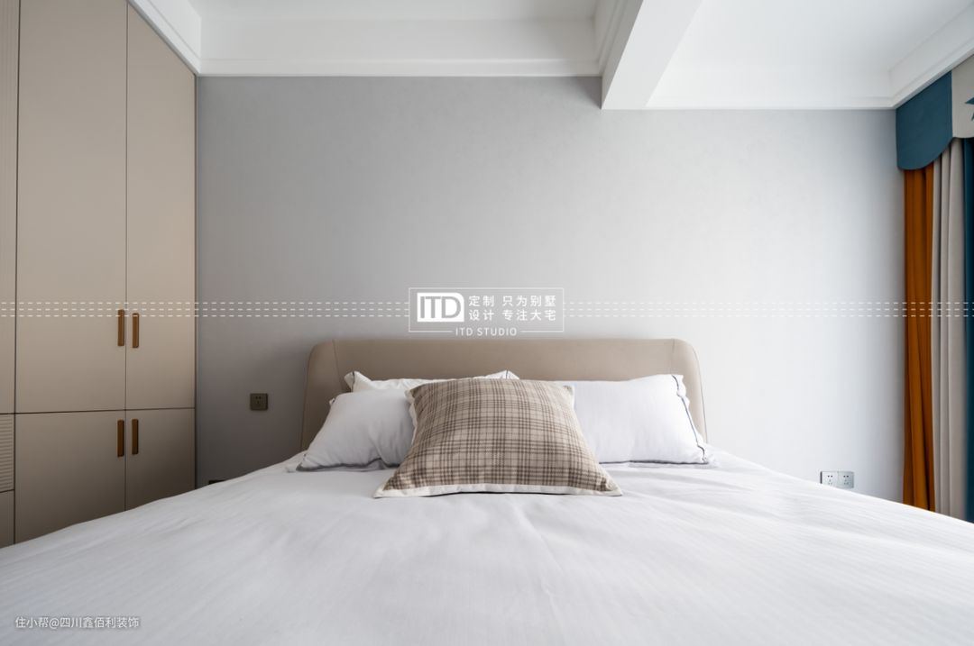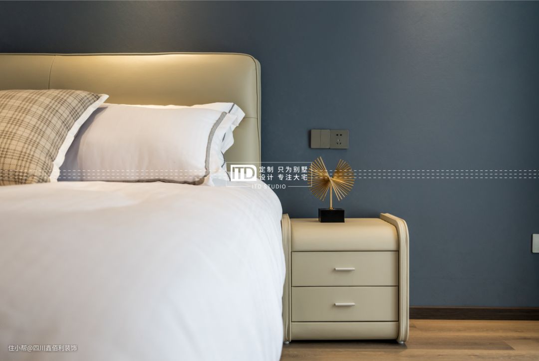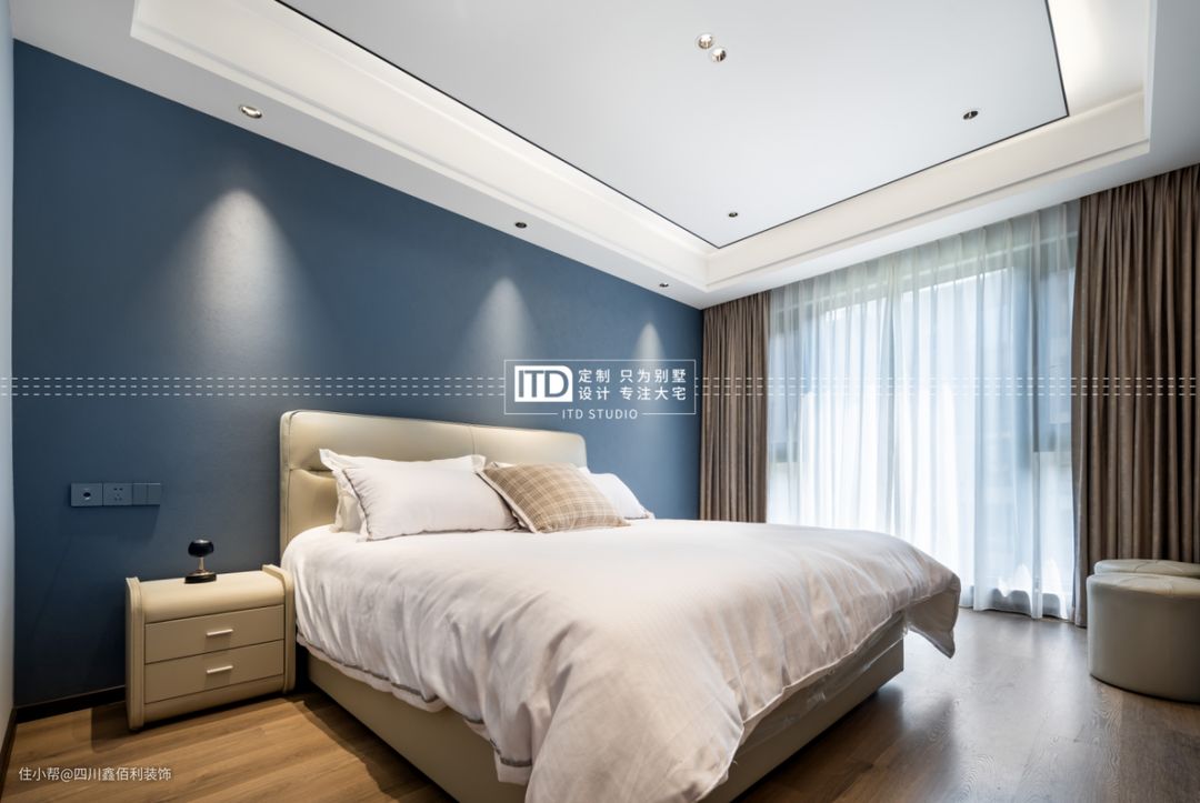 业主喜欢色彩对比强烈的空间,于是卧室遵循了高对比度的设计思路。大面积的蓝色背景墙,渲染出一个温柔雅致的空间,与柔软素雅的奶白色床具形成微妙的色温对比。温润的地板采用鑫佰利ITD无缝拼接技术,将自然、材质最大限度的表达出来。视觉、触觉、功能无一落下,没有过多的“矫饰”,更显简约大气。