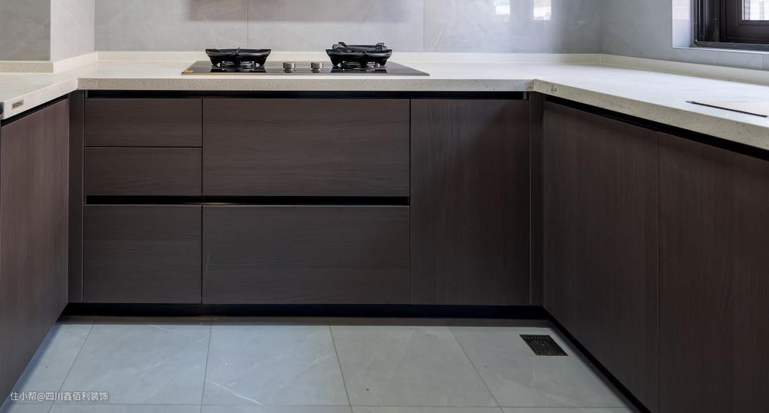 在家里,不管是谁主厨,一个好的厨房绝对能让整个烹饪过程高效节能。U型厨房设计,洗涤区、烹饪区及操作台、冷藏区等空间划分极其明确,功能配置充足,动线无缝衔接,既满足了使用空间的需求,又减少物品拿取往复的时间。吊柜与地柜做分色处理,丰富层次,视觉更有质感,将冰箱、洗碗机全部做嵌入式设计,从而加大了整体空间的开阔感。