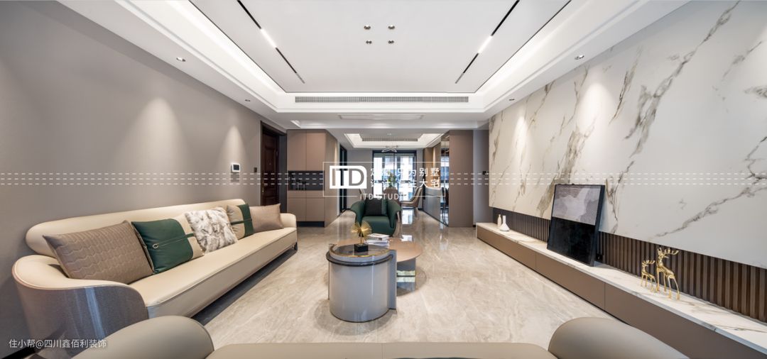 将视野转向客厅,悬浮式吊顶以1公分的不锈钢线条修饰,四周做双眼皮叠级实现高低错落的美感,让空间更有层次感和造型感。在灯光的设计上,业主妈妈极倾向现代流行的无主灯设计,以磁吸轨道灯+隐藏灯条满足基础照明,筒灯作为辅助,强调重点,待几天后,墙面将迎来精心挑选的装饰画幅,轻奢优雅的居家氛围更添浓厚。