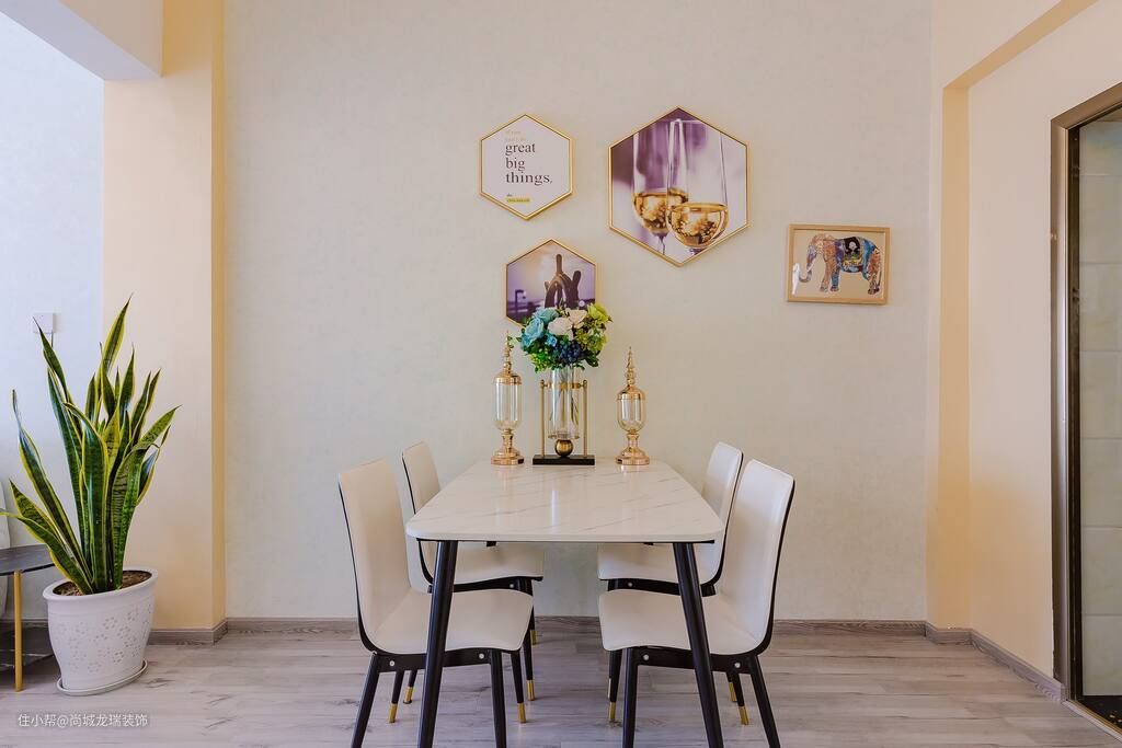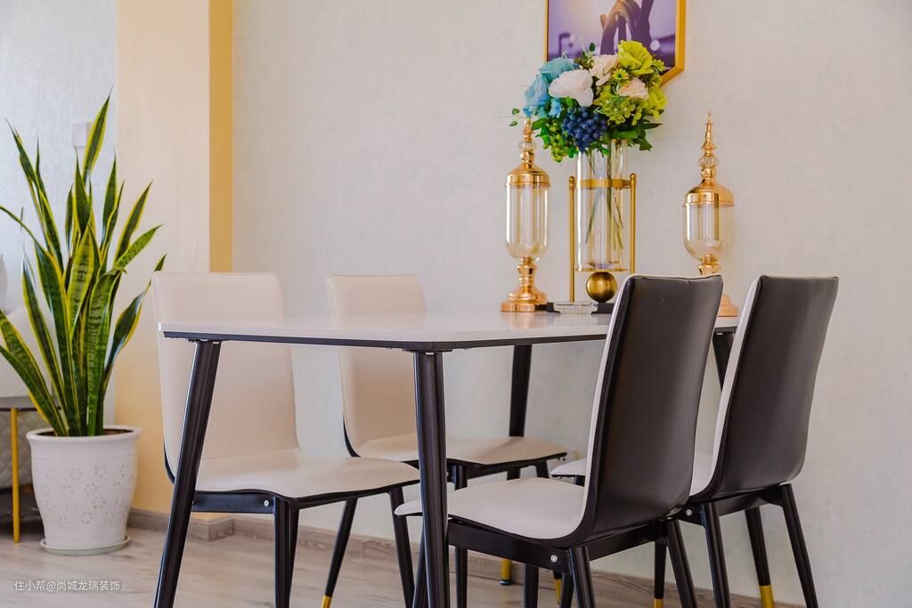 餐厅的设计相对简约些,白色的餐桌椅保证空间的立体和层次的美感,整个空间在细节处融为一体,让人不觉得压抑,反而清新舒适,釉面的设计让空间质感不至于过于清冷,有一种宜室宜家的美感。